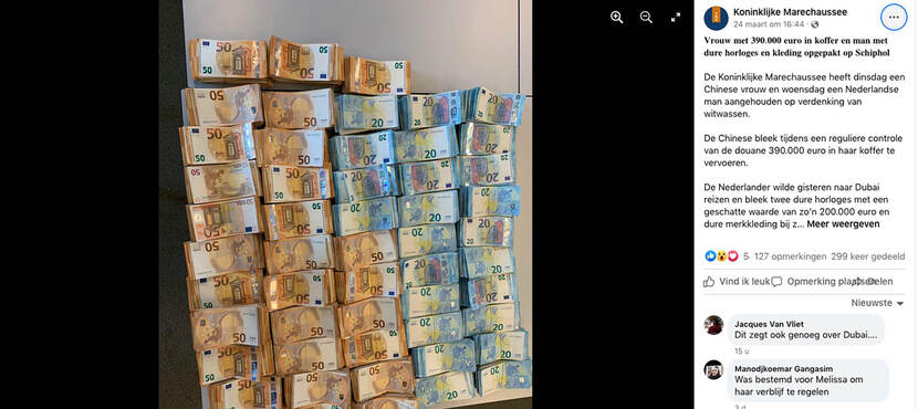 De Koninklijke Marechaussee heeft een Chinese vrouw en een dag later een Nederlandse man aangehouden op verdenking van witwassen. De Chinese bleek tijdens een reguliere controle van de Douane € 390.000,- in haar koffer te vervoeren.