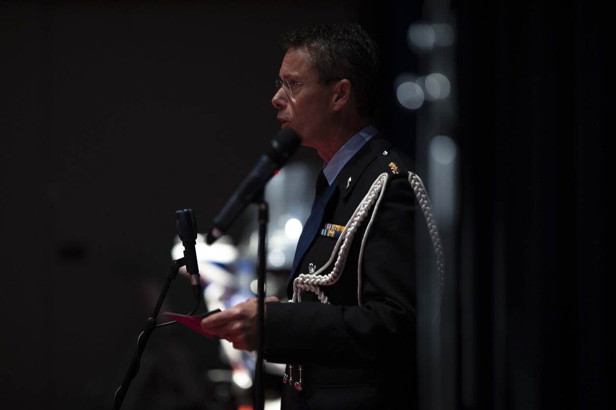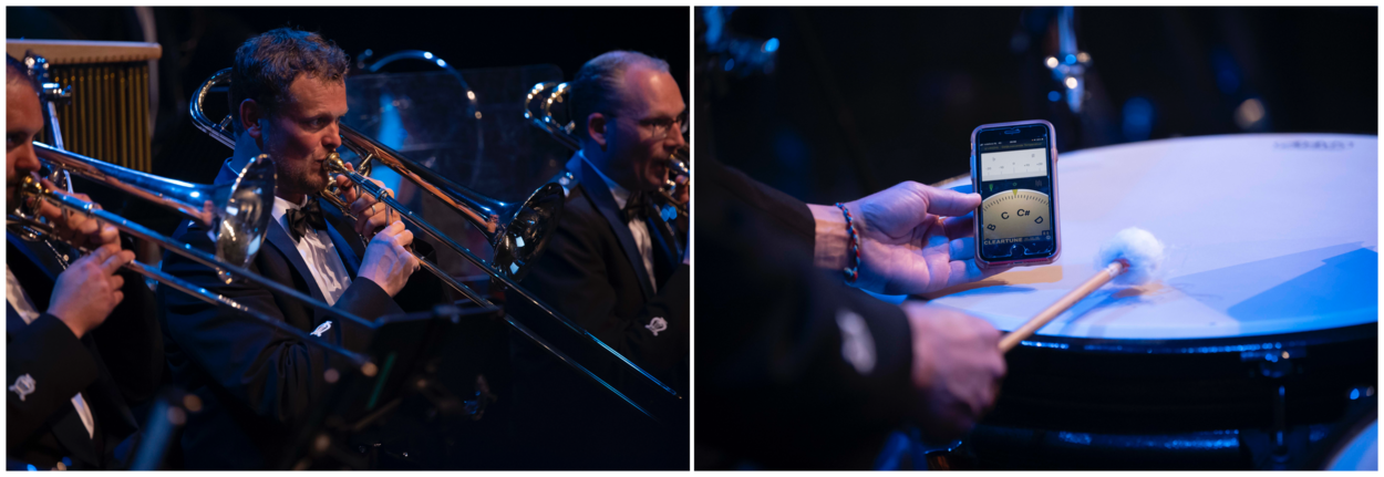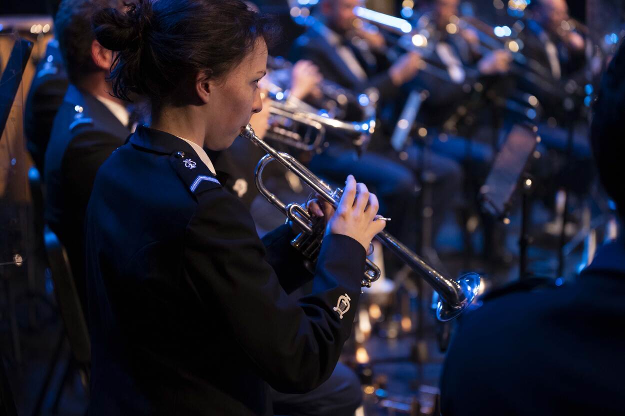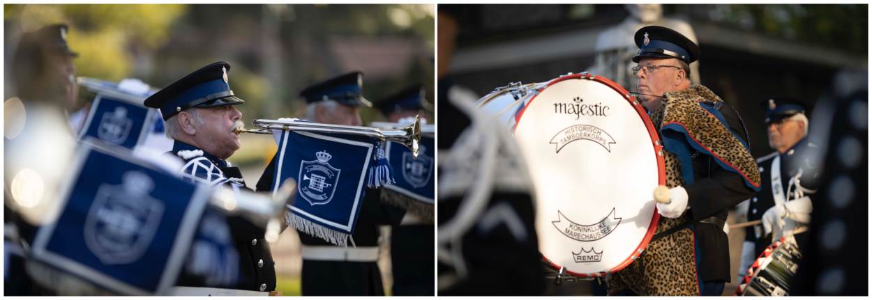Bij de ontvangst buiten werden de bezoekers onthaald met muziek van het Historisch Tamboerkorps Koninklijke Marechaussee. Tijdens het welkom heten van de gasten, refereert commandant Leurink ook aan de recentelijk doorgevoerde reorganisatie van het orkest, die op 1 mei 2021 officieel is ingegaan. Twee derde van de muzikanten is omgeturnd van reservist naar militair met een vaste aanstelling. Tamboer-maître en bibliothecaris wachtmeester-1 Marc overhandigt de mars ‘Quantum Ad Illis’ - Latijn voor ‘Als het erop aankomt’ - aan commandant van de Marechaussee luitenant-generaal Hans Leijtens. De mars is gecomponeerd door componist Theo Jetten van het orkest als dank aan iedereen die een rol van betekenis heeft gehad bij de reorganisatie. Het orkest van de Marechaussee heeft een fanfarebezetting met 50 professioneel opgeleide muzikanten. Met de klok mee: dirigent kapitein Peter Kleine Schaars, slagwerker wachtmeester-1 Rutger, bassiste wachtmeester Bente. Het orkest bracht onder meer ‘Choral Intermezzo’ van componist Christiaan Janssen ten gehore en de compositie ‘Libertadores' van de Spaanse componist Oscar Navarro. Na de pauze volgde een lichte muziekshow met onder andere muziek van Abba, Doe Maar en Charles Aznavour. Saxofoonsolo van wachtmeesters-1 Daan en Maik bij het speciaal door de Engelse componist en saxofonist Andy Scott voor het Orkest KMar gecomponeerde nummer ‘Looking Back, Looking Forward’. Het orkest, waarvan de naam sinds 2019 gewijzigd is van Trompetterkorps der Koninklijke Marechaussee naar de meer toepasselijke naam Orkest Koninklijke Marechaussee, verzorgt onder meer de muzikale omlijsting bij militaire plechtigheden bij de Marechaussee, geeft Anjer-, relatie- en korpsconcerten en neemt deel aan taptoes. Zowel in Nederland als in het buitenland. Links: de trombonesectie, rechts: het stemmen van een pauk.