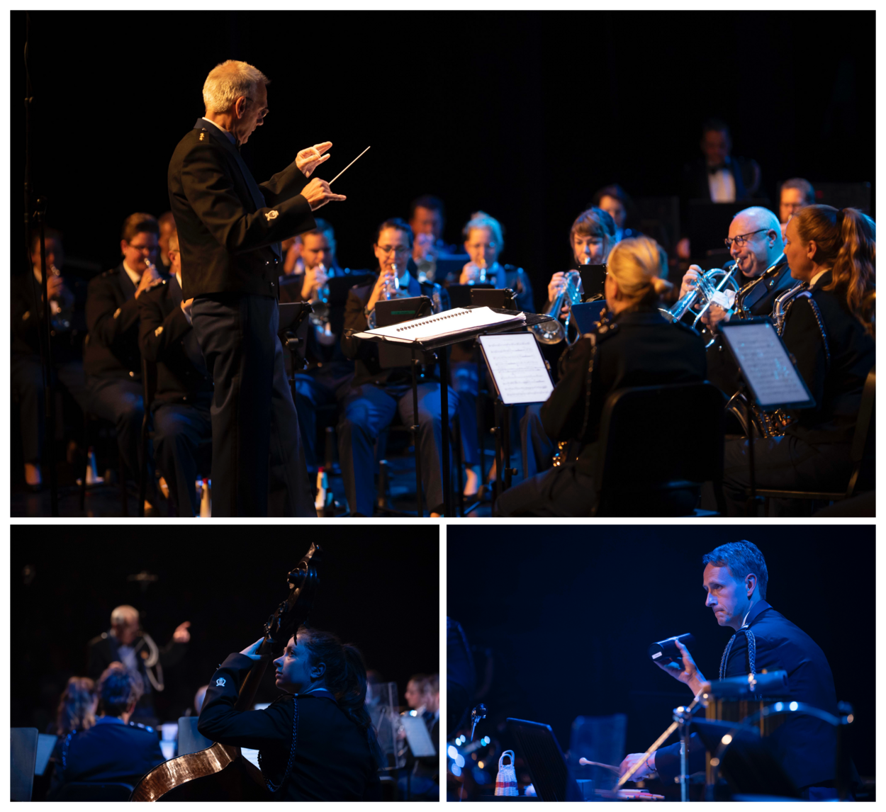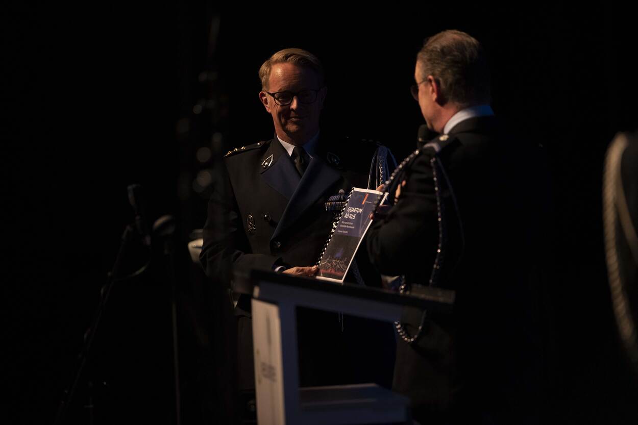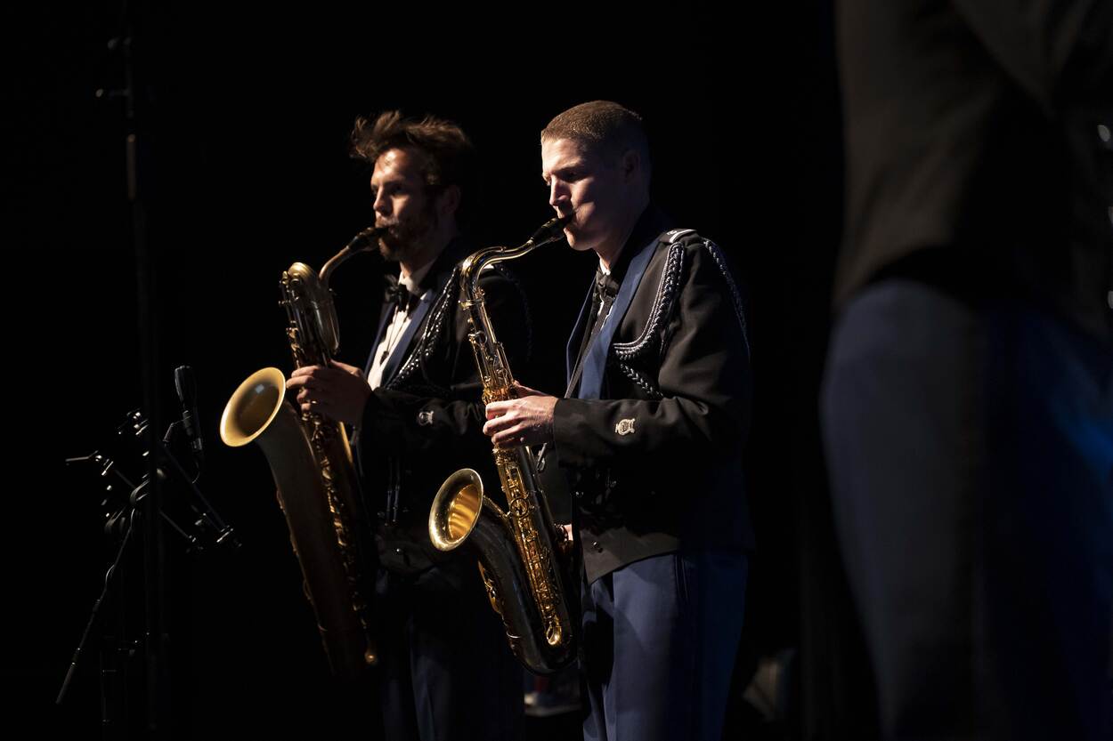 Bij de ontvangst buiten werden de bezoekers onthaald met muziek van het Historisch Tamboerkorps Koninklijke Marechaussee. Tijdens het welkom heten van de gasten, refereert commandant Leurink ook aan de recentelijk doorgevoerde reorganisatie van het orkest, die op 1 mei 2021 officieel is ingegaan. Twee derde van de muzikanten is omgeturnd van reservist naar militair met een vaste aanstelling. Tamboer-maître en bibliothecaris wachtmeester-1 Marc overhandigt de mars ‘Quantum Ad Illis’ - Latijn voor ‘Als het erop aankomt’ - aan commandant van de Marechaussee luitenant-generaal Hans Leijtens. De mars is gecomponeerd door componist Theo Jetten van het orkest als dank aan iedereen die een rol van betekenis heeft gehad bij de reorganisatie. Het orkest van de Marechaussee heeft een fanfarebezetting met 50 professioneel opgeleide muzikanten. Met de klok mee: dirigent kapitein Peter Kleine Schaars, slagwerker wachtmeester-1 Rutger, bassiste wachtmeester Bente. Het orkest bracht onder meer ‘Choral Intermezzo’ van componist Christiaan Janssen ten gehore en de compositie ‘Libertadores' van de Spaanse componist Oscar Navarro. Na de pauze volgde een lichte muziekshow met onder andere muziek van Abba, Doe Maar en Charles Aznavour. Saxofoonsolo van wachtmeesters-1 Daan en Maik bij het speciaal door de Engelse componist en saxofonist Andy Scott voor het Orkest KMar gecomponeerde nummer ‘Looking Back, Looking Forward’. Het orkest, waarvan de naam sinds 2019 gewijzigd is van Trompetterkorps der Koninklijke Marechaussee naar de meer toepasselijke naam Orkest Koninklijke Marechaussee, verzorgt onder meer de muzikale omlijsting bij militaire plechtigheden bij de Marechaussee, geeft Anjer-, relatie- en korpsconcerten en neemt deel aan taptoes. Zowel in Nederland als in het buitenland. Links: de trombonesectie, rechts: het stemmen van een pauk.