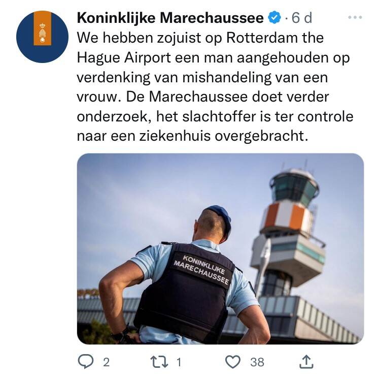 Een vrouw is er in geslaagd ongezien de beveiliging van Rotterdam The Hague Airport te omzeilen. Ze stapte op een Transavia-vlucht en vloog mee naar Spanje. Na een tussenlanding in Madrid is ze gearresteerd. Een woordvoerder van de Koninklijke Marechaussee bevestigt dit verhaal. Pas na het terugkijken van camerabeelden zag de marechaussee dat de vrouw zonder controle langs de beveiliging was gekomen. Daarop werd de gezagvoerder van de Transavia-vlucht verteld dat er een verstekeling aan boord zat. Het vliegtuig maakte vervolgens een tussenlanding in Madrid. Daar hielden Spaanse agenten haar aan.