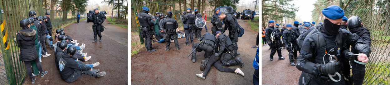 De aanvankelijk vreedzame sit-down bij de ingang van een overheidsgebouw kwam daarna aan de beurt. Enkele demonstranten hadden zich vastgeketend aan een hek bij een overheidsgebouw en blokkeerden de toegang. Ze kregen van de marechaussees zowel het aanbod tot overleg als het aanbod tot vrijwillig vertrek, maar daaraan gaven ze geen gehoor. Dus ook hier kon het peloton tot ontruiming overgaan. Proportioneel welteverstaan, dus een schild was niet nodig. Tot een deel van de betogers toch ging provoceren en de ME steviger moest ingrijpen. Sommige betogers die hevig weerstand boden, stemden dankzij een lichte prikkel met de wapenstok op de achilleshiel er alsnog mee in om te worden weggedragen.