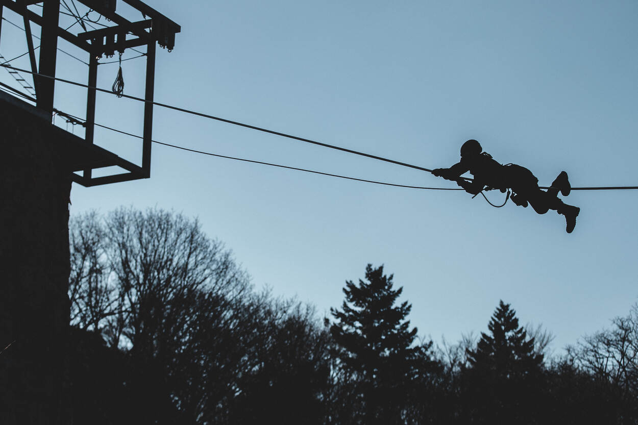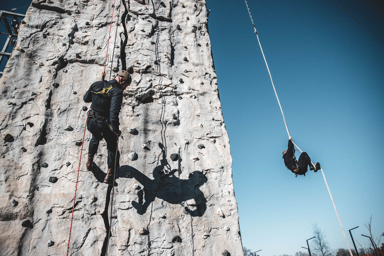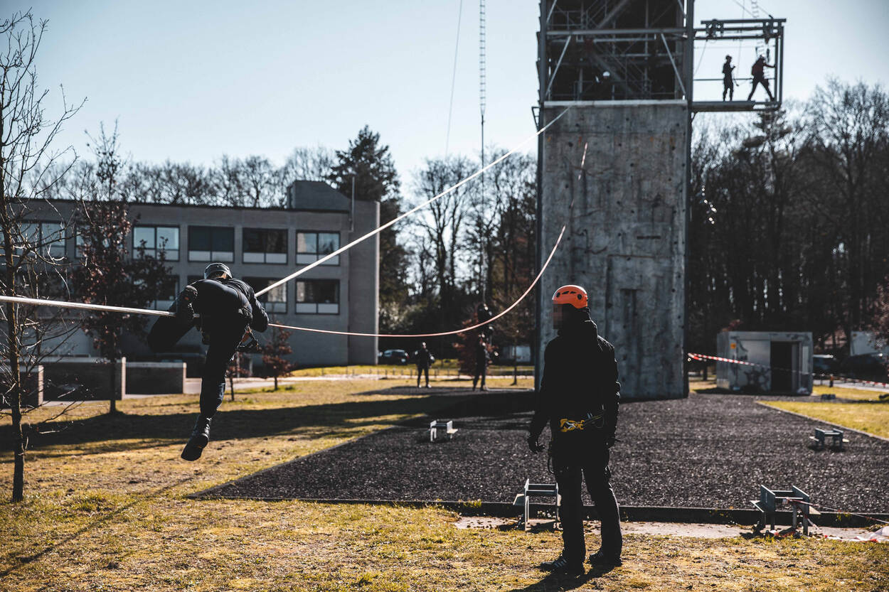 Stap van de cold in de hot zone. Nadat de groep in 2 is verdeeld gaan de helmen op en de klimtuigen aan. Tijd om de hoogte in te gaan. Uiteraard is de trap geen optie. “Niet denken: wat als? Maar: wat moet ik doen?” In de woorden van de instructeur klinkt het eenvoudig, tot je eenmaal in de touwen hangt en op je buik voorwaarts schuift. Een lijn van 60 meter loopt van de grond naar een hoogte van 10 meter. Het eerste stuk gaat soepel, het laatste is slopend. “Ze krijgen hem niet gratis.” Een andere manier om de toren in te komen is door het touw te beklimmen, dat overloopt in een touwladder. Het zwarte touw hangt er als borging, voor de veiligheid, maar vertraagt de klimmer hier ook mee. Een extra uitdaging. Eén van de cursisten heeft de touwladder net bedwongen. Hijgend komt hij aan op de 20 meter. “Ik heb nog niet alle onderdelen gehad, maar in de categorie ‘zware onderdelen’ doet deze trap leuk mee”, lacht hij. De cursist heeft een achtergrond bij het Korps Mariniers en 11 Luchtmobiele Brigade. “Ik wilde al een tijdlang naar de BSB, maar kampte met een blessure. Die werd met een operatie verholpen. Toen was het nu of nooit. Ik zie de BSB echt als een uitdaging. Veel doorgroeimogelijkheden, veel uitdaging, veel verantwoordelijkheid en altijd operationeel.” “Ik had al een beetje het gevoel dat deze oefening eraan zat te komen. Als ze zeggen ‘verzamelen onder de klimtoren’ heb je wel een redelijk idee wat er gaat gebeuren. Maar dit?”, zegt hij, terwijl hij naar het parcours kijkt, “….is wel weer bijzonder creatief.” “Die hoogte zit ik niet mee. Het is vooral fysiek pittig. We hebben al een behoorlijk programma achter de rug. Je begint nu te merken dat je lijf op begint te raken. Vooral de armen zijn erg verzuurd.” Tijd om een beetje bij te komen is er bij de afdaling. Soepel zakken de deelnemers terug naar de grond. Voor de één is het de hoogte, voor de ander is het de verzuring die parten speelt. ‘Walltopia’ is een uitdaging van het fysieke en de cognitieve component. De instructeurs grijpen ieder moment aan om de toekomstige BSB’ers door de oefening te helpen. Met aanmoediging, aansporing of advies: wat op dat moment nodig is. “Voor sommigen is dit een mindfuck”, zegt adjudant Wouter. De toren kent nog een trap. Op een hoogte van 10 meter klimmen de BSB’ers naar een hoogte van 15 meter, hangend aan de armen. “Grepen gebruiken! Touw los! Dat is voor de veiligheid. Je zult dit op eigen kracht moeten doen.” Klauterend beweegt een cursist langs de lijn om de toren heen. Op de tast is het zoeken naar steunpunten voor de voeten en hangpunten voor de handen. Kijkend in de diepte valt dat niet mee. Vanaf de grond komt de aanmoediging. “Alles geven, maak je boos! Hoog die voeten!” Aan het einde wacht hen een beloning: de tyrolienne. “Waarbij de toekomstige BSB’ers aan een zipline op 20 meter de diepte inspringen. Een genietmoment”, aldus adjudant Wouter.