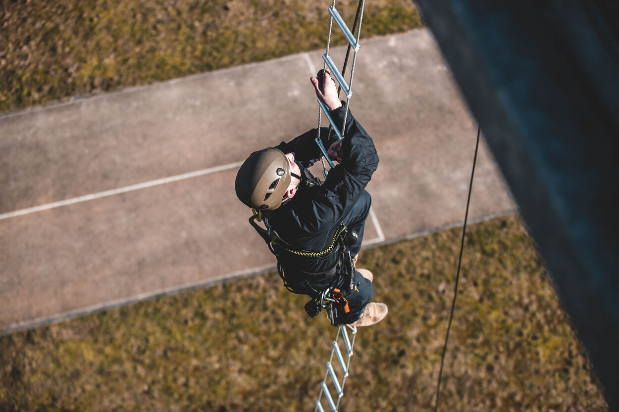Adjudant Wouter, coördinator Werken op Hoogte BSB, bouwde met zijn team een circuit van 5 klimonderdelen. Elk deel werd vooraf uitvoerig getest, onder andere met een verzwaarde pop. “Veiligheid voor alles”, aldus de adjudant. Aan de deelnemers om de onderdelen te overwinnen. “Een training als deze is werken onder stress. De deelnemers leren ervaren wat dat lichamelijk, maar ook mentaal teweegbrengt.”