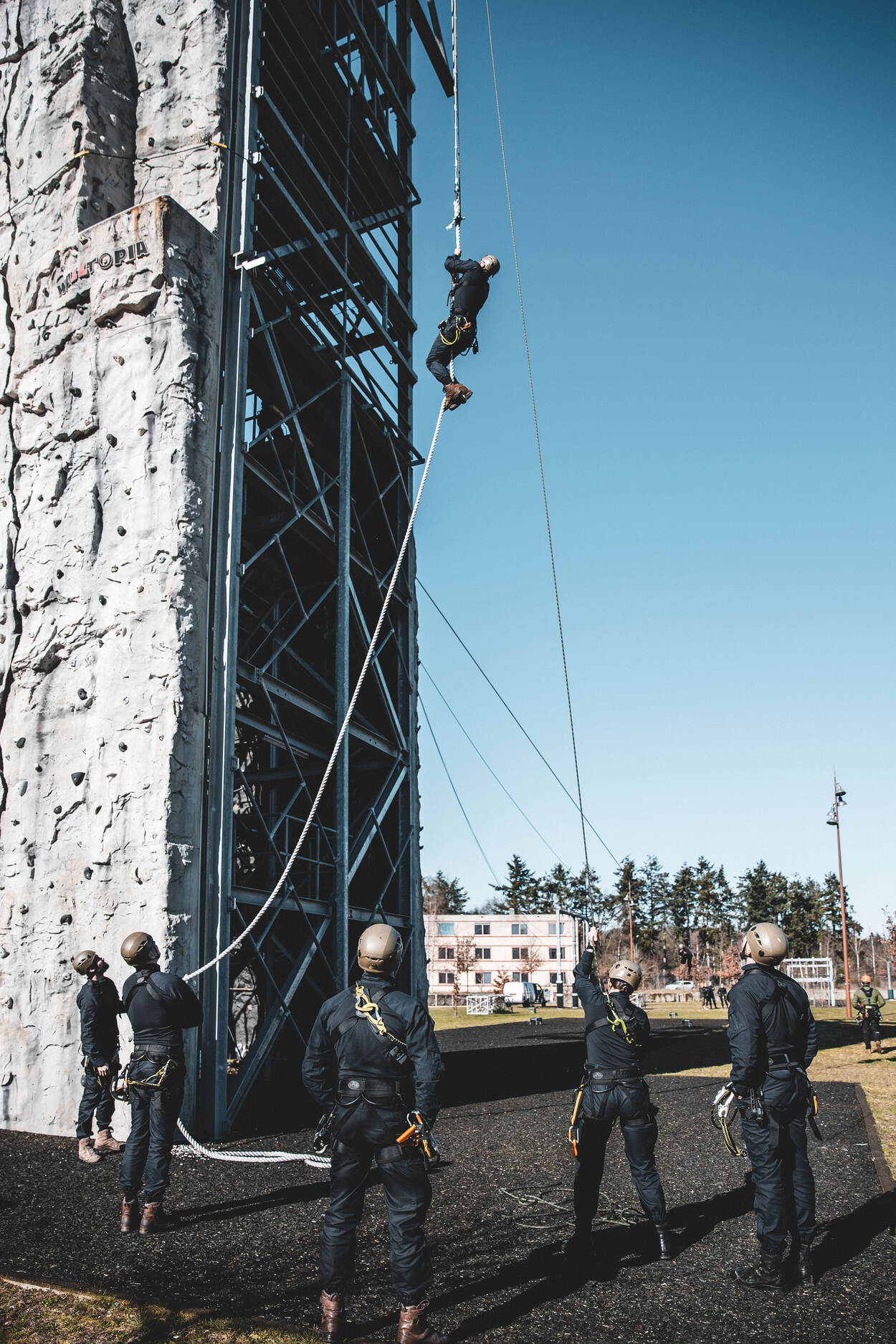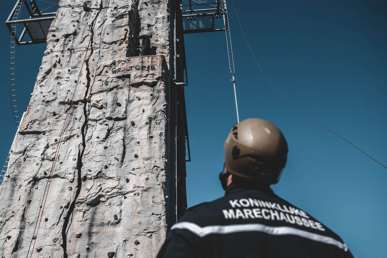 12 BSB’ers in opleiding trotseerden eind vorige maand de klimtoren op het Opleidings-, Trainings- en Kenniscentrum Koninklijke Marechaussee (OTCKMar) in Apeldoorn. Het speciaal voor hen ontwikkelde parcours maakte deel uit van oefening Max.