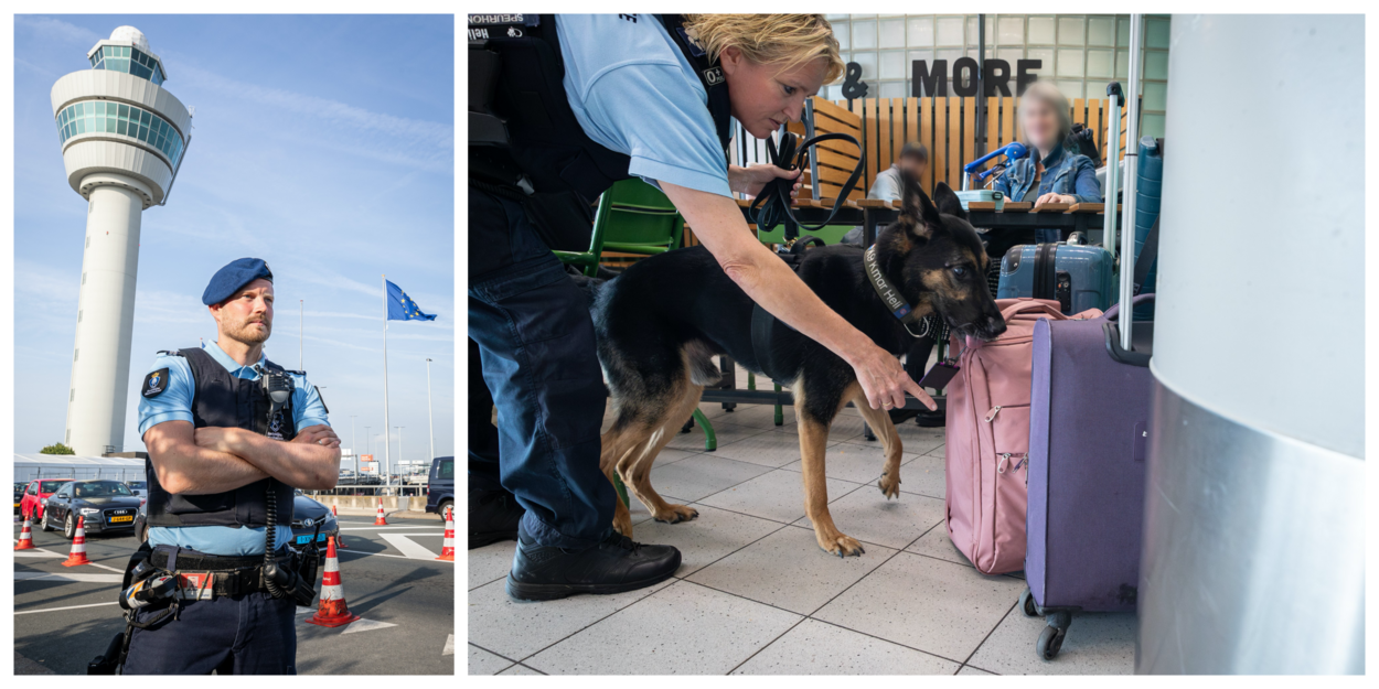 Maar dat wil niet zeggen dat Jeffrey en zijn collega’s van de Politiedienst kunnen ontspannen. Jeffrey is vandaag ‘commandant Plaza’, wat betekent dat zijn team toezicht houdt in de winkelgebieden, het treinstation en de vertrekhallen. Buiten surveilleren collega’s in een auto of op de motor. Als ze iets verdachts zien grijpen ze in. Denk bijvoorbeeld aan onbeheerde bagage, waarvoor dan een explosievenhond wordt opgeroepen, om te checken of er niks geks in de tas zit. Zoiets komt eigenlijk elke dag wel meerdere malen voor, weet Jeffrey. “Of we reageren op meldingen die via de beveiliging van Schiphol of onze eigen meldkamer binnenkomen.”
