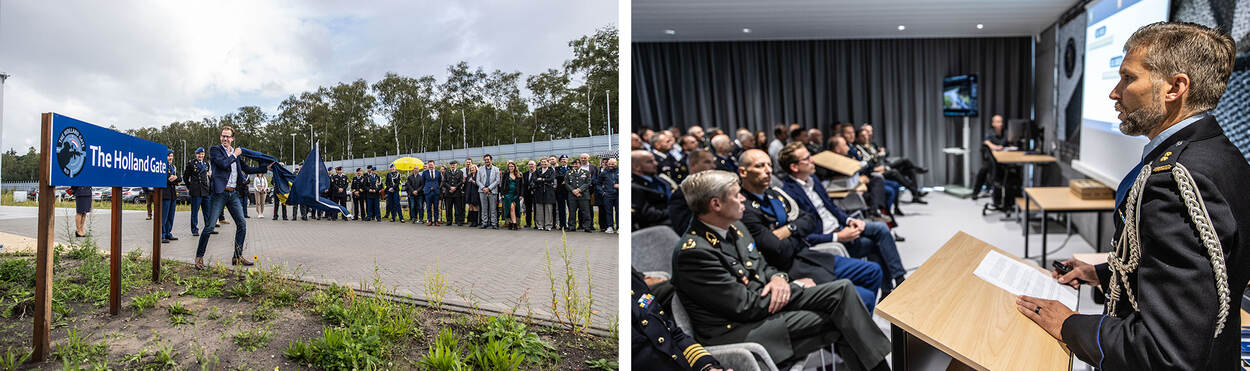 Het schiethuis heeft de naam The Holland Gate gekregen. Perfect gekozen, zei staatssecretaris van Defensie Christophe van der Maat tijdens de onthulling van het naambord. Het is vernoemd naar de veiligheidscorridor tijdens de evacuatie in Afghanistan in 2021 die Nederlandse special forces hadden gecreëerd om mensen in veiligheid te brengen. De naam The Holland Gate staat symbool voor deze succesvolle samenwerking in het kader van veiligheid. En de samenwerking gaat hier verder, in het schiethuis. “Ik kijk uit naar de synergie die hier zal ontstaan”, sprak BSB-commandant luitenant-kolonel Jeffrey van Horn opgetogen tijdens de opening. Tijdens de opening werden de gasten getrakteerd op een spectaculaire demonstratie om de trainingsmogelijkheden en het nut van de nieuwe ‘shooting house’ te tonen. De actie begon met BSB’ers die een vip in veiligheid brachten in het schiethuis. Vervolgens werd het huis overvallen door gewapende belagers, en verzochten de operators via de meldkamer om bijstand en richtten zij een verdedigingsstelling in. Daarna werden mariniers met een politieheli via fastroping op het dak afgezet om de vip en de BSB te ontzetten, en bliezen andere operators tegelijkertijd de voordeur op om binnen te komen. Even later kon het publiek in het schiethuis vanaf de balustrades zien hoe de operators de kamers één voor één zuiverden. Aan het einde van de demonstratie ging plotseling het licht aan en klonk een noodsignaal. “Dit is wat er gebeurt als je de stopknop indrukt.” Projectleider van het schiethuis en oud-marinier Martin liet de uitgebreide veiligheidsmaatregelen zien die genomen zijn in en om het gebouw. Zo zijn op verschillende plekken op de balustrade grote rode knoppen geplaatst voor de instructeurs, die de oefening op elk moment kunnen stilleggen. Het is een van de vele maatregelen. Alles is gedaan om de oefenlocatie zo veilig mogelijk te maken. Aanleiding voor de versnelde bouw van deze faciliteit was namelijk helaas een noodlottig ongeval in 2016 in een schiethuis in Ossendrecht. Om herhaling te voorkomen is daarom met de grootst mogelijke zorg nagedacht over de veiligheidsmaatregelen in deze nieuwe oefenlocatie. De trainingsmogelijkheden in The Holland Gate zijn eindeloos. Met behulp van geluids- en lichteffecten, verduistering, verplaatsbare wanden en ‘aanschietbaar’ meubilair kunnen er allerlei scenario’s in scene worden gezet. Ook kunnen delen van deuren worden opgeblazen, mogen ramen van buiten naar binnen worden beschoten en zijn de wanden kogelabsorberend. Operators mogen hier zowel staand, zittend als liggend met scherpe munitie schieten, en ook kunnen ze procedures trainen in trappenhuizen. Verder kunnen ze het gebouw buitenom beklimmen en ervan abseilen. Kortom, het schiethuis is gemaakt voor training in het hoogste geweldsspectrum. “Mooi toch!”, zei Martin enthousiast over de veelheid aan opties. Zo goed als elk gewenst scenario kan hier opgevoerd worden. En als het er nog niet is, kan het op verzoek worden uitgewerkt. In het nabijgelegen facilitaire gebouw kunnen in een klusruimte en in een pc-ruimte zowel fysiek als digitaal allerlei elementen aan een oefening worden toegevoegd. “De beheerders denken met ons mee. Onmogelijkheden zijn er bijna niet”, zegt een operator van de BSB. “We zijn hier hartstikke blij mee.” In het schiethuis hangen tientallen camera’s. Dankzij een videoregistratiesysteem kunnen de trainingen daardoor worden gevolgd en begeleid vanuit de nabijgelegen regiekamer. Ook kunnen de beelden na afloop uitvoerig bekeken en geëvalueerd worden voor een nog groter leereffect. Dat de Brigade Speciale Beveiligingsopdrachten het nieuwe schiethuis in eigen beheer heeft is veel waard. Soms is even bellen en vragen of er plek is genoeg. Bovendien kunnen eenheden nu makkelijker een dag of een dagdeel trainen, in plaats van steeds voor een hele week te verplaatsen naar een oefenlocatie in het buitenland. Al zal dat nog steeds gebeuren, om divers te kunnen trainen in verschillende Close Quarter Battle-omgevingen. Verder is het makkelijker om een training in Nederland in te plannen met speciale eenheden van verschillende krijgsmachtdelen dan in het buitenland. De Brigade Speciale Beveiligingsopdrachten zal in dit schiethuis vooral vip-extractie oefenen, oftewel het ontzetten van een vip. De operators werken vaak in gevaarlijke gebieden in het buitenland bij de bescherming van vip’s op en rond ambassades. Als de dreiging hoog is, moet je op het ergste voorbereid zijn. Dat kunnen ze hier trainen. De kamers zijn in te richten als kleine ruimtes, net als op menig ambassade. “Dit schiethuis is bedacht voor en door speciale eenheden. Onze wensen zijn hierin meegenomen”, zegt een BSB-operator tevreden. Naast het schiethuis komt een overdekte 100 meter schietbaan, waar momenteel hard aan wordt gewerkt. Hier kunnen de eenheden statisch, dynamisch en met operationele voertuigen trainen. De indoor schietbaan krijgt een nieuw luchtverversingssysteem, zodat de schutters geen last hebben van schietgassen. Naar verwachting is de schietbaan in de tweede helft van 2024 gereed voor gebruik.
