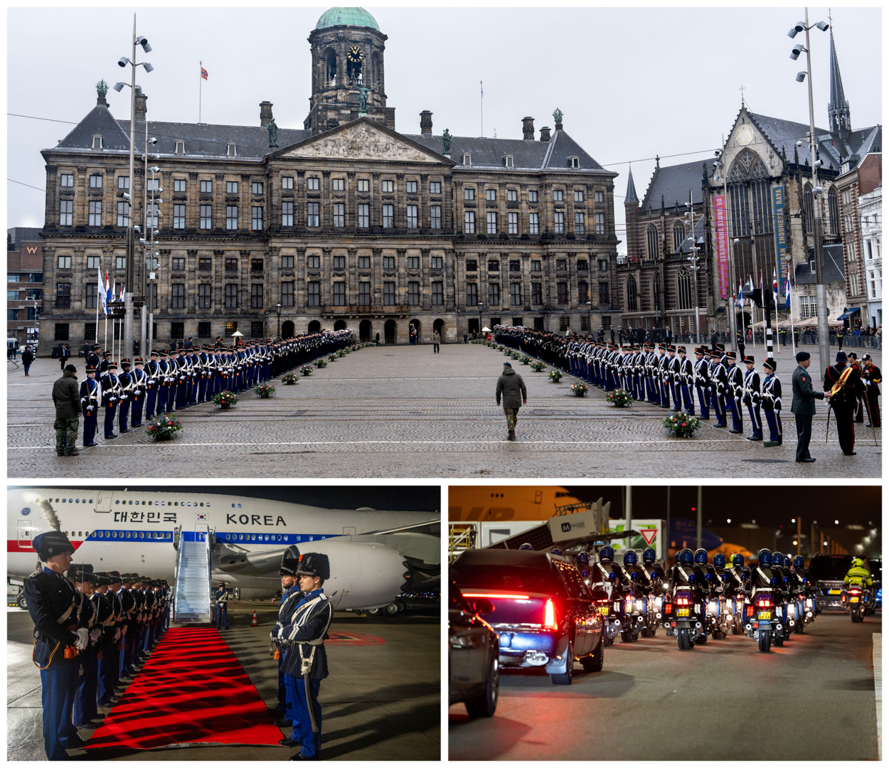 2 dagen duurde het staatsbezoek van de Zuid-Koreaanse president Yoon Suk-yeol en zijn vrouw aan ons land. Samen met koning Willem-Alexander en koningin Máxima legden ze onder meer een krans bij het monument op de Dam, was er een ontmoeting met veteranen en een staatsbanket. Drukke tijden dus voor de Koninklijke Marechaussee, die verantwoordelijk is voor zowel de beveiliging van het Paleis op de Dam als het ceremoniële gedeelte. Wij spreken met 3 collega’s over wat er allemaal komt kijken bij zo’n staatsbezoek.