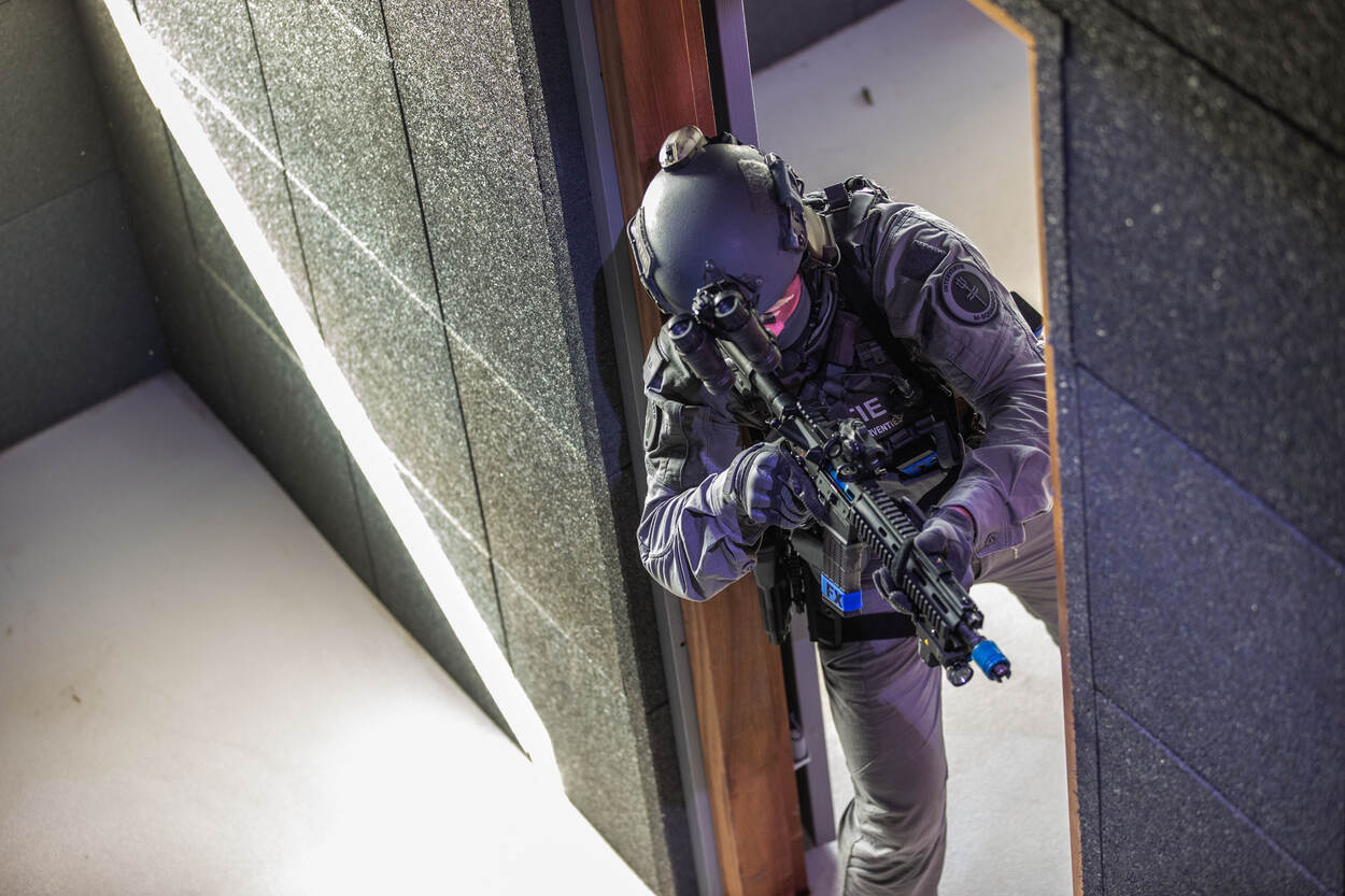 ‘Uniek’, ‘hypermodern’ en ‘ fantastisch’. Het regent superlatieven tijdens de opening van het gloednieuwe schiethuis voor speciale eenheden van Defensie in Nederland. In het 3 etages tellende gebouw kunnen special forces, onder wie operators van de Brigade Speciale Beveiligingsopdrachten, vuurwapengevechten op korte afstand oefenen.