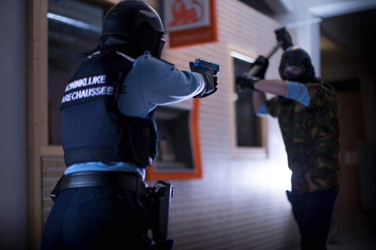 “We gebruiken airsoft voor reality based trainen, we oefenen scenario’s die in het echte werk ook kunnen voorkomen”, vervolgt de adjudant. Bijvoorbeeld aanhoudingstactieken. Airsoft maakt het mogelijk om in een vroeg stadium al wapenhandelingen toe te voegen aan een scenario, zegt Tom. “Het is een tussenstap die we nu niet hebben. Het vult een gat tussen droog trainen en live fire.”