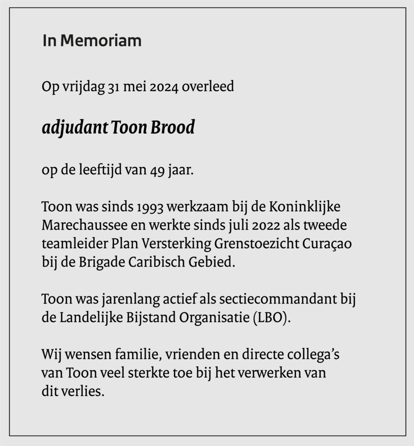Luitenant-kolonel Roland Scheltes heeft op dinsdag 4 juni het commando van de Brigade Caribisch Gebied overgedragen aan luitenant-kolonel Gerhard Smit. Na het tragische verlies van adjudant Toon Brood, afgelopen vrijdagnacht, heeft de commando-overdracht in aangepaste vorm plaatsgevonden.