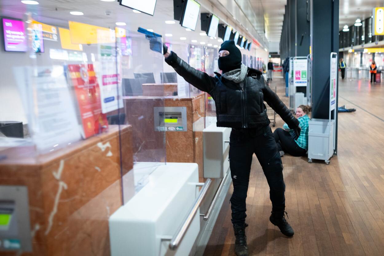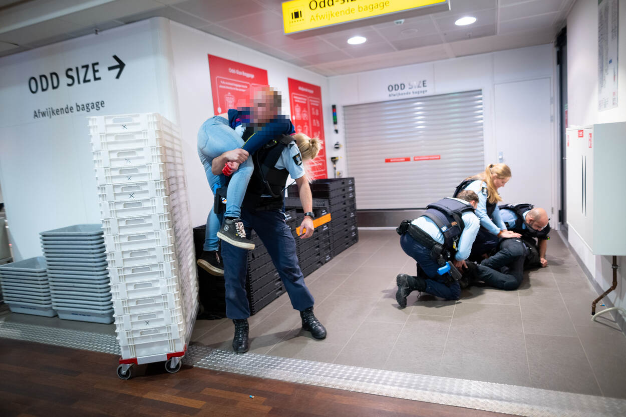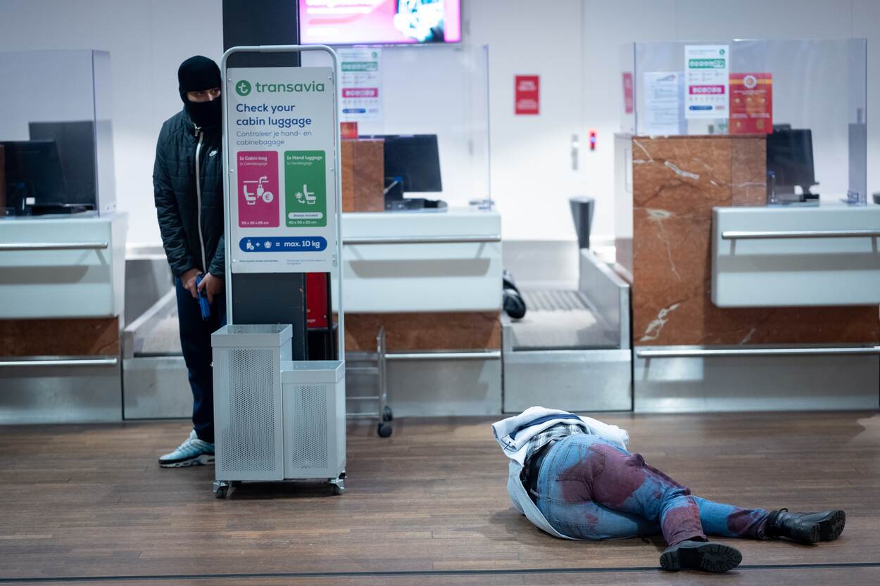 Paniek, paniek!! 2 terroristen komen schietend de vertrekhal binnen. Passagiers hollen gillend en schreeuwend alle kanten uit. Zodra er gewonden vallen, is de chaos compleet. Hulp laat niet lang op zich wachten. Kort na de eerste schoten, arriveren de mannen en vrouwen van brigade Zuid-Holland. Met vuur en beweging treden ze tegen de terroristen op. Aan de jaarlijkse oefening die in het teken staat van de AMOK-procedure doen naast ruim 100 marechaussees, die verspreid over 6 dagen in actie komen, 25 MBO-leerlingen ‘Bewaken en Beveiligen’ van het Hoornbeeck College deel. Zij nemen de rol van de passagier op zich. Een van de terroristen wordt snel overmeesterd. Het kost enige moeite, want hij verzet zich hevig. Gelukkig is de Marechaussee in groten getale aanwezig. Zodra ook dader 2 is ingerekend en de situatie veilig is, beginnen de dienders met het verlenen van EHBO en het afvoeren van de gewonden. De pseudo-terroristen spelen hun rol met volle overgave, net als de gewonden. Laatstgenoemden zijn afkomstig van Grip5. Dit zijn medisch opgeleide trauma-acteurs, gespecialiseerd in het uitbeelden van deze rol. Alsof er nog niet genoeg hectiek is, hebben de terroristen ook een bom in een van de recyclebakken gegooid. De ruimte moet worden geëvacueerd in afwachting van de Teamleider Explosiever Verkenner die een inschatting maakt voor de Explosieven Opruimingsdienst Defensie (EOD). Amok ‘24 is een oefening waarin, de naam zegt het al, de AMOK-procedure centraal staat. Deze procedure is gericht op het zo snel en veilig mogelijk uitschakelen van een ‘active shooter’ zodat deze niet meer slachtoffers kan maken. Collega’s beoefenen de procedure regelmatig, ook op hun reguliere werkplek, om voorbereid te zijn op een dergelijke situatie. Hierbij worden zij ondersteund door collega’s van de Integrale Beroepsvaardigheidstraining (IBT). Voordat de marechaussees in de vertrekhal worden getraind, hebben deze eerder op de dag deelgenomen aan een training elders in Rotterdam. Hierin lag na de nadruk op het aanleren van individuele skills op onder meer het gebied van het zuiveren van objecten. Op de luchthaven wordt tevens aandacht besteed aan het trainen van de benaderingstechnieken bij gevaarlijke verdachten. De oefening in de vertrekhal van de luchthaven wordt gehouden nadat de laatste vlucht is aangekomen en iedereen de terminal heeft verlaten. Aan de training gaat veel voorbereiding vooraf. Zo komt het voor dat de oefening wordt verlaat omdat een vlucht vertraging heeft.