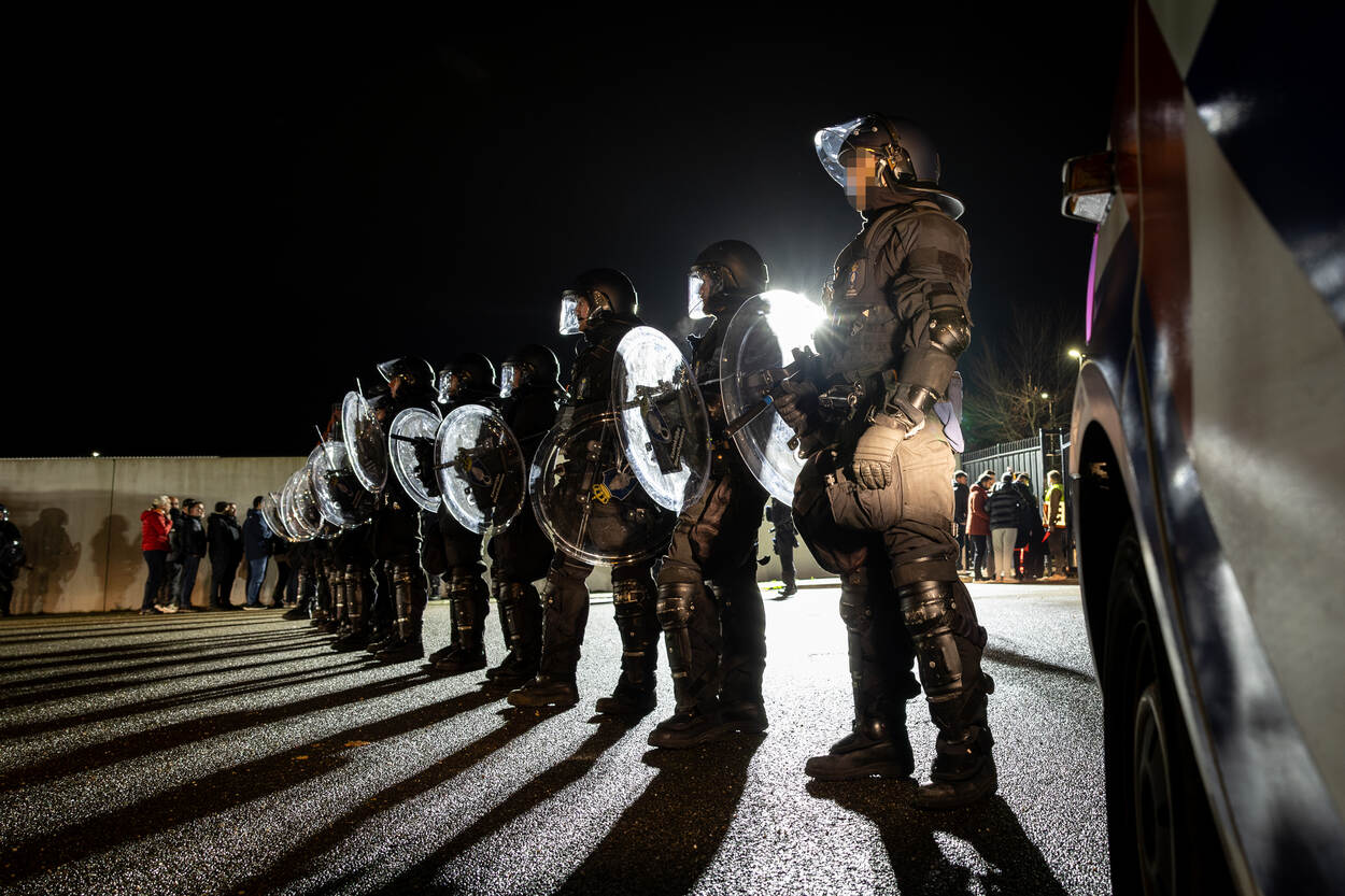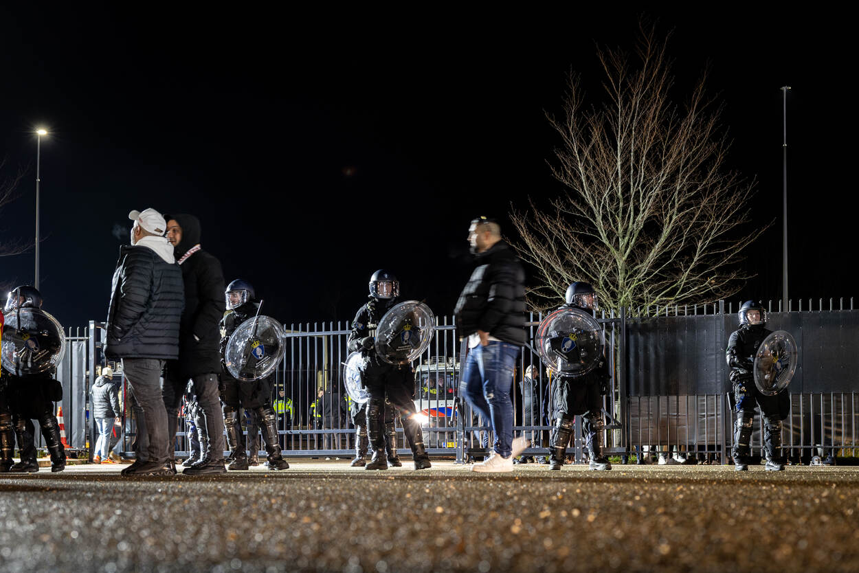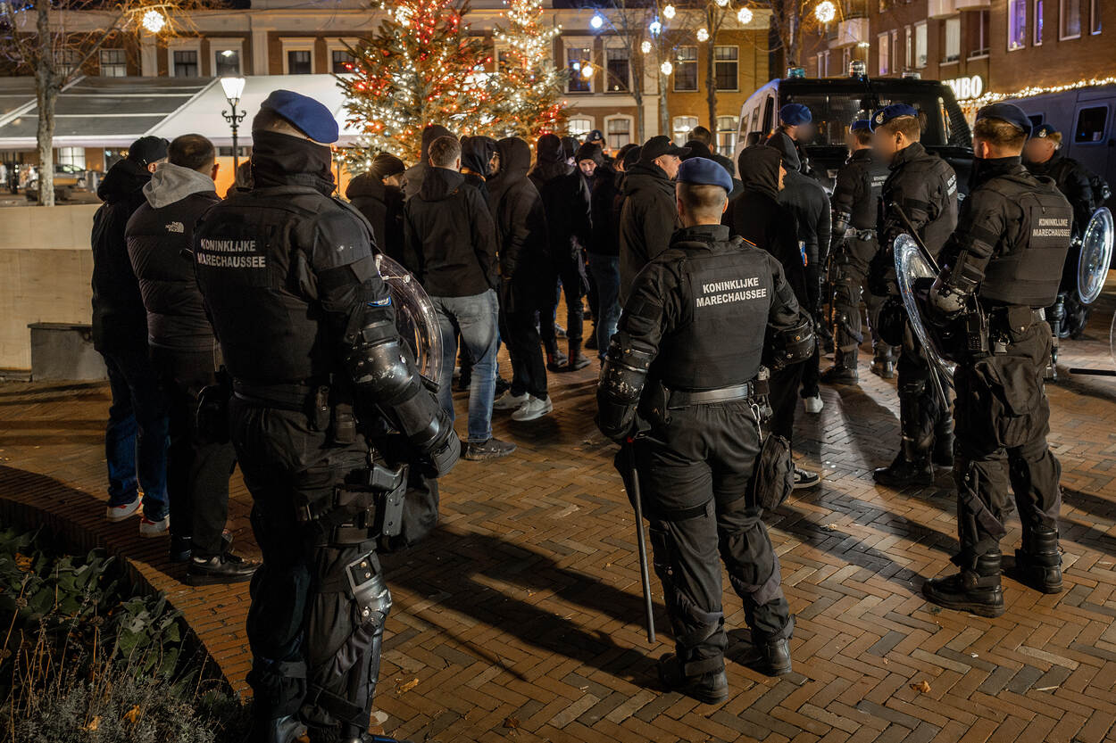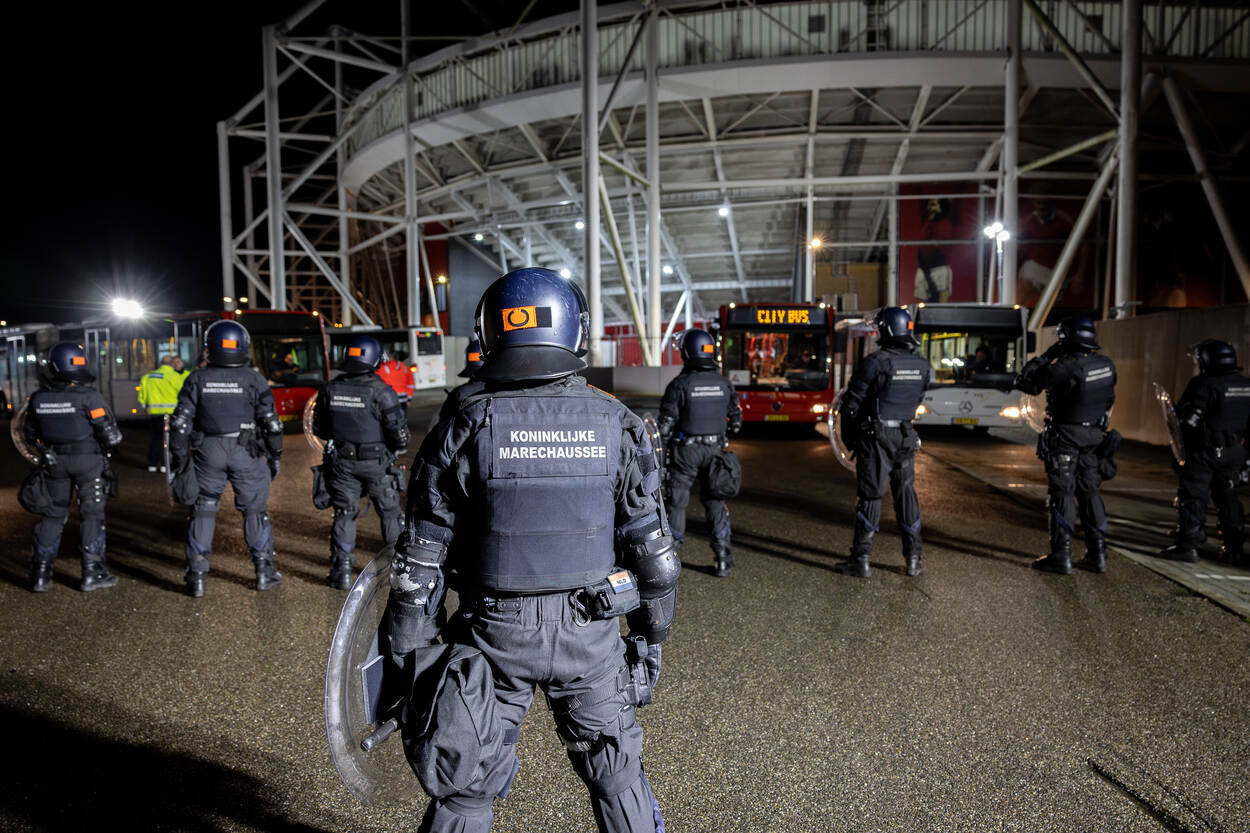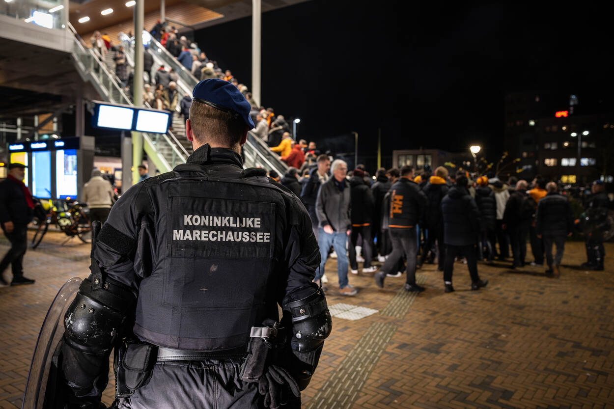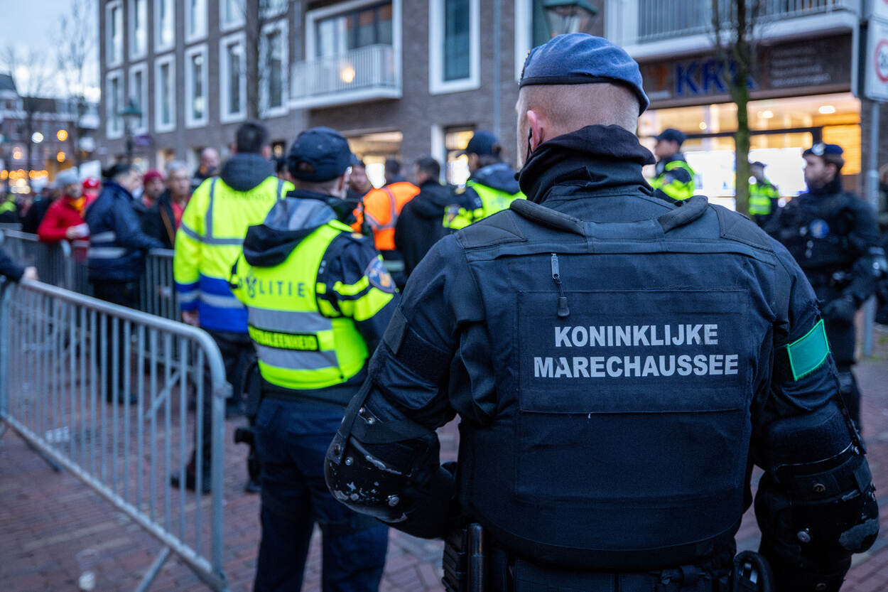 De supporters van Galatasaray komen in groten getale van heinde en verre aan met bussen, treinen en eigen vervoer, maar worden naar een aangewezen locatie geleid buiten het stadscentrum van Alkmaar. Daar fouilleert de Marechaussee sommige fans preventief. De focus ligt met name op het bezit van wapens en vuurwerk. Hierna staan bussen gereed om de supporters te vervoeren naar het stadscentrum. Vervolgens wordt de Turkse aanhang, mits in het bezit van een geldig ticket, per bus vervoerd naar het AFAS Stadion. De Marechaussee opereert op de Paardenmarkt in het stadscentrum als back-up van de politie bij het handhaven van de openbare orde. De marechaussees vormen er een buitenring rondom een politiepeloton van de mobiele eenheid. Bij eventuele escalaties kunnen de marechaussees bijspringen. Dat blijkt nauwelijks nodig. Uiteindelijk worden slechts enkele supporters van de Turkse kampioen uit elkaar gehaald na wat onderlinge onenigheid. De standaarduitrusting van de marechaussees is met wapenstok en schild praktisch hetzelfde als van de mobiele eenheid van de politie. De zwarte overalls zien er wel anders uit dan de outfit van de politie met hun kenmerkende gele streep. Nadat de wedstrijd eindigt in een gelijkspel volgen de Turkse fans alle instructies op van de marechaussees en verlaten zij per bus het stadion bij knooppunt Kooimeer. Dat gaat gepaard met een hoop enthousiasme en luid gezang. De aanhangers van Galatasaray komen vanuit heel Europa. In de kaasstad verzamelen zich naar schatting 1500 Turkse voetbalfans uit onder meer Nederland, Duitsland, België en Frankrijk. “De rol die wij vervullen tijdens AZ – Galatasaray biedt automatisch ontlasting van de politie. Bovendien kunnen wij zelf extra ervaring opdoen. Doordat de LBO niet heel groot is, treden wij vaak gezamenlijk op. Ondanks de cultuurverschillen tussen de Marechaussee en de politie hebben we een eenheid van optreden en zijn onze procedures nagenoeg hetzelfde”, licht Cas toe. Sommige supporters hangen tijdens de wedstrijd nog wat rond in het centrum van Alkmaar. Zij hebben geen geldig ticket op zak en willen in elk geval niet meer naar de wedstrijd. Omdat een deel van hen in de stad zorgt voor wat onrust, begeleidt de Marechaussee hen vanuit het stadscentrum richting het station. Daar blijven zij op het perron totdat de fans in de trein stappen. De Marechaussee werkt rondom AZ – Galatasaray ook deels samen met de bereden politie. Doordat op de Paardenmarkt de gemoederen ietwat oplopen, staan beide eenheden daar zij aan zij. Een mooie samenkomst. Iets wat na afloop van de wedstrijd wordt onderschreven. “Het is gewoon leuk om vanuit dezelfde taakstelling ook dezelfde werkwijze te hanteren”, blikt Cas terug. “Ondanks dat je aparte organisaties bent, heb je hetzelfde doel voor ogen. Voor onze mensen was het heel mooi om weer een trainingsprikkel te krijgen.”