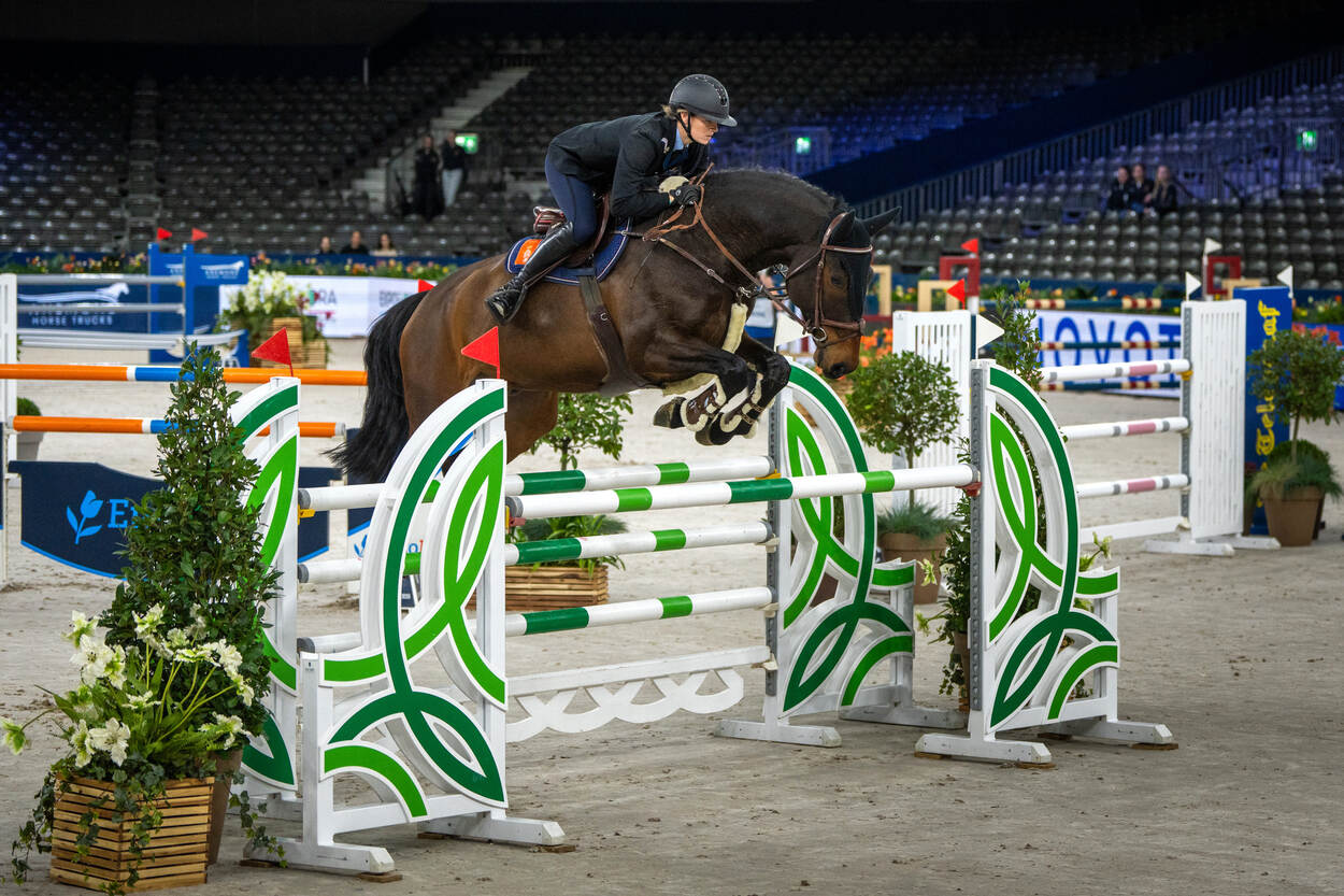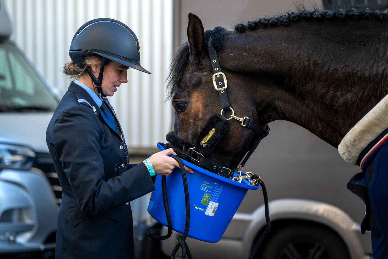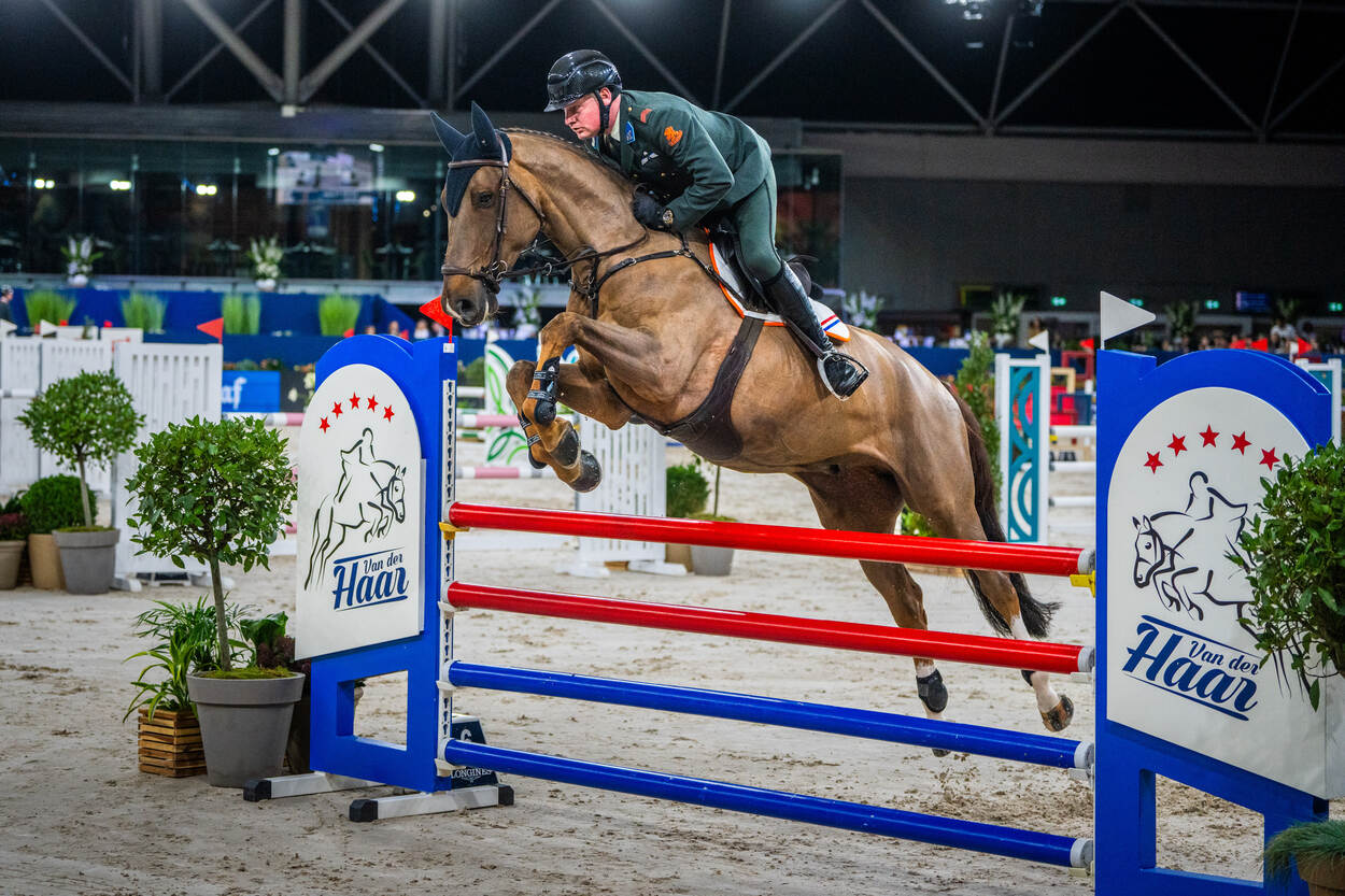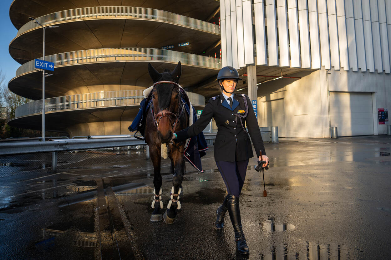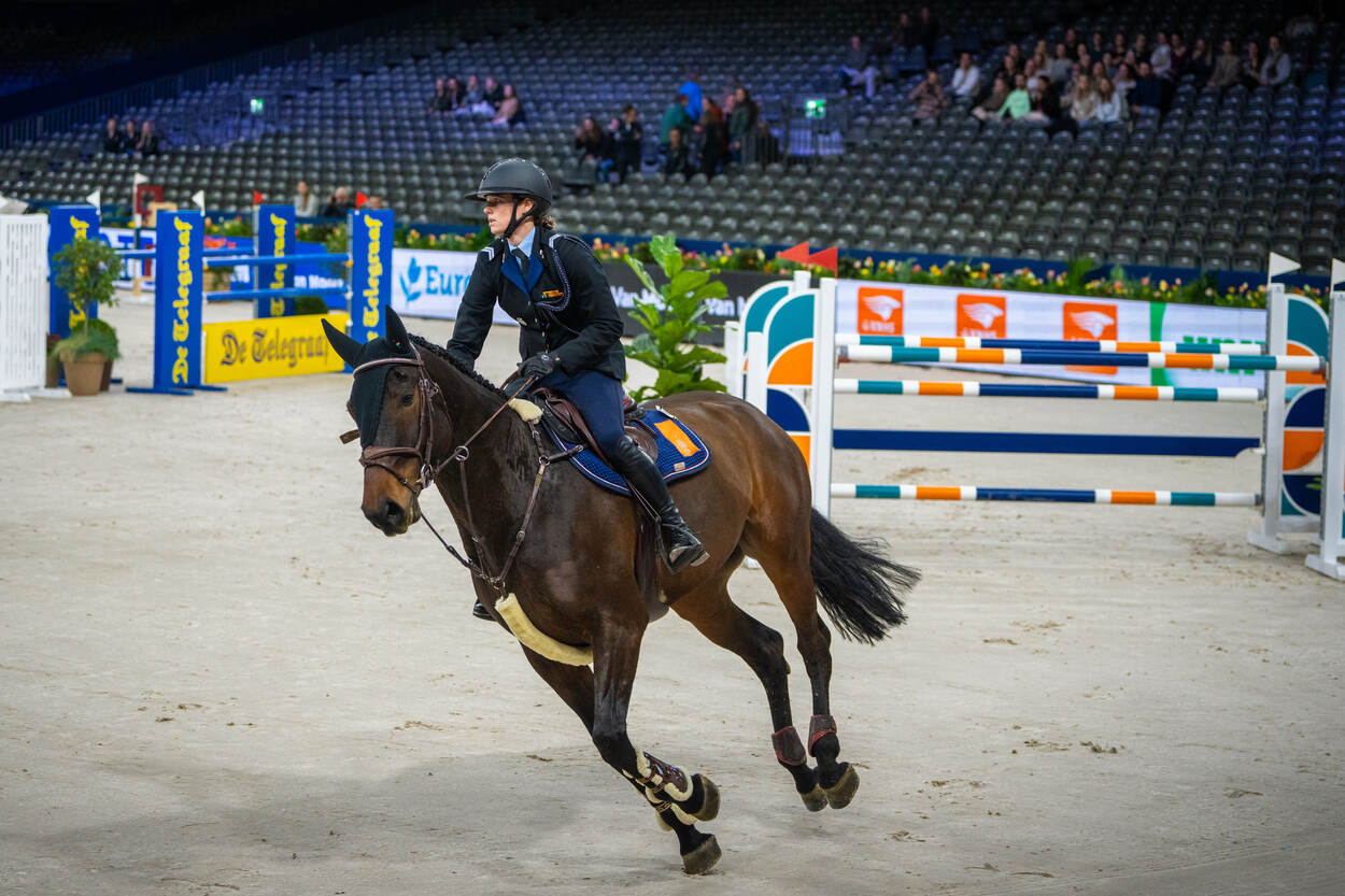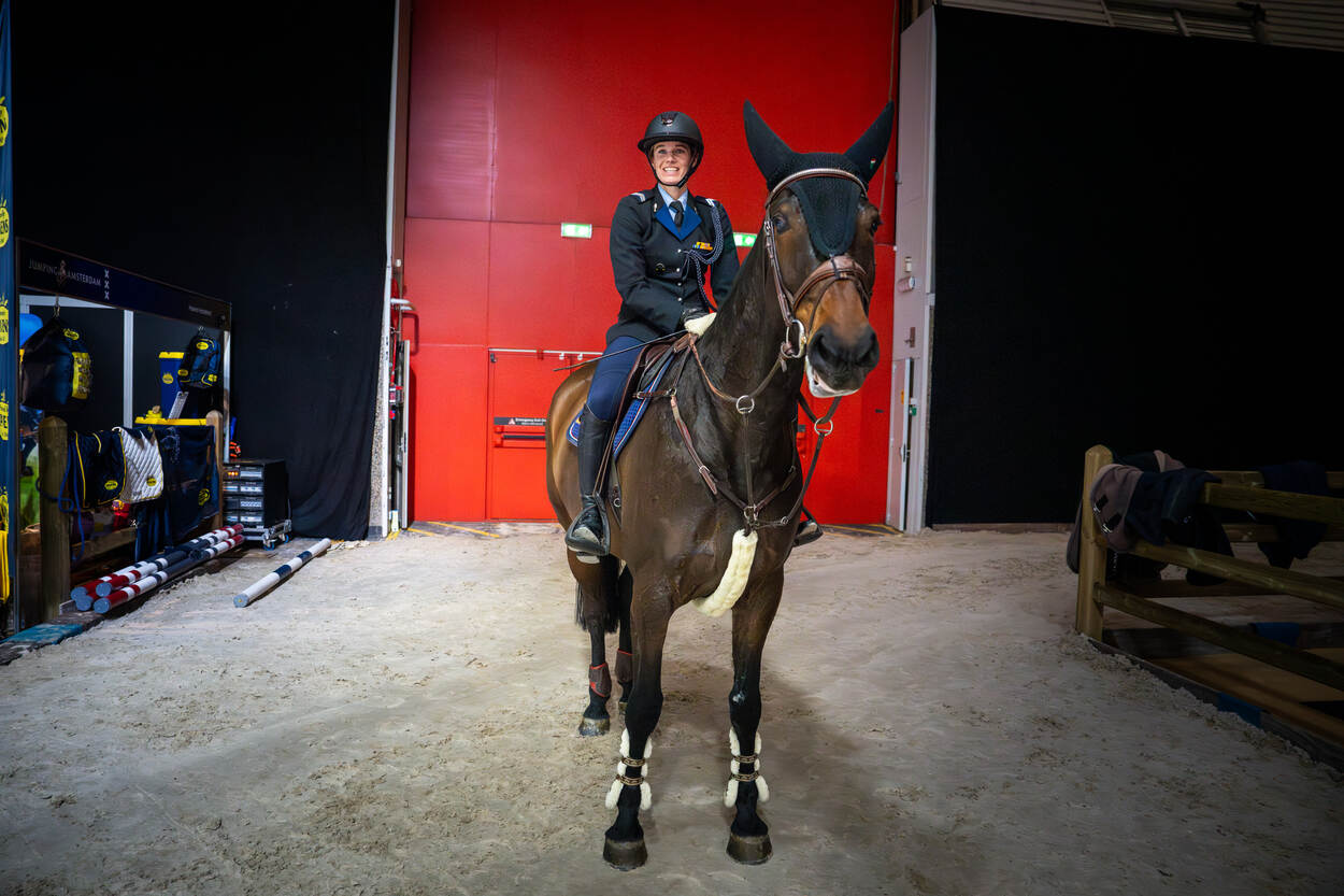 Opperwachtmeester Stephanie (35) en Luxor kwamen uit op het hoogste niveau in de landelijke wedstrijdcategorieën, ‘rubrieken’ in de paardensport. Samen legden zij een parcours af met hindernissen van 1.35 meter hoog. Dit is een klasse net onder de professionele rubrieken, waar hindernissen tussen de 1.40 en 1.60 meter hoog zijn. “Het publiek reageerde goed op de aanwezigheid van collega’s in uniform”, zegt majoor Arthur, teammanager van het nationale militaire team en commandant van de Bereden Brigade Koninklijke Marechaussee. “Er waren zelfs enkele mensen die zich bij Defensie willen aanmelden om deel uit te maken van de Bereden Brigade. Dus deelname is mooie reclame.” Stephanie moest tijdens Jumping Amsterdam als eerste aan de bak met de 9-jarige Luxor. “Ik had gezonde spanning. Niet alleen omdat er veel collega’s kwamen kijken, maar ook omdat het de eerste keer was voor Luxor dat hij in de Amsterdam RAI moest presteren.” De eerste ronde verliep foutloos. Tijdens de zogeheten barrage, waarbij snelheid belangrijk is, maakte het koppel slechts 2 fouten. Desondanks vielen ze helaas net buiten de prijzen. “Toch ben ik enorm trots. We hebben een supermooi rondje gereden”, aldus Stephanie, die in het dagelijks leven werkt op Bureau Ceremonieel in Den Haag. Het militair team bestond uit 1 ruiter van de Marechaussee en 3 cavaleristen van de landmacht. Deze teamgenoten kwamen uit in de rubrieken 1.30, 1.20 en 1.10 meter. Jumping Amsterdam is een groot hippisch evenement waar de focus ligt op springwedstrijden. Verdeeld over 4 dagen zien zo’n 55.000 toeschouwers hoe de ruiters en paarden proberen zo foutloos en snel mogelijk het parcours af te leggen. “Deze discipline stamt uit de militaire traditie. Daarom was het mooi om ook daar een team aanwezig te hebben”, aldus Arthur. “Ze hebben het fantastisch gedaan.” Ruiter en paard moeten nauw samenwerken om een mooie prestatie neer te zetten. De hindernissen waren hoog en de looplijnen technisch, blikt Stephanie terug. “Dus ik moest mijn focus vasthouden. Ik wilde een goed rondje neerzetten, zeker omdat er veel support aanwezig was.” Van tevoren maakte ze een rijplan voor de juiste looplijn. Ze telde de galoppassen om te weten hoeveel sprongen ze tussen de hindernissen moest maken. “Als dat niet helemaal lukt, moeten het paard en ik tussendoor het ritme herstellen om bij de volgende hindernis alsnog goed uit te komen. Het plan is gelukt. Ik heb voor mijzelf in het basisparcours een perfect rondje neergezet. Beter had niet gekund.” Succes tijdens een springwedstrijd ligt voor zo’n 75 procent bij een goed paard dat kan én (hoog) wil springen, weet Arthur. En dan moet de combinatie van ruiter en paard ook nog tijdens een indrukwekkende ambiance als Jumping Amsterdam presteren. “Wanneer een paard daar niet aan gewend is, kan dat zorgen voor een slechtere prestatie. Maar een talentvolle ruiter kan dat bijsturen. Uiteraard op zo’n manier dat het veilig is voor mens én dier. Dat staat voorop.” Het militaire team is onderdeel van het Bureau Internationale Militaire Sport (BIMS). Talentvolle militairen kunnen dankzij BIMS onder werktijd trainen en wedstrijden rijden. “Komend jaar hebben we nog diverse trainingen en wedstrijden op het programma staan”, vertelt Arthur. “Meedoen is belangrijker dan winnen. Het idee achter BIMS is om een goede werkgever te zijn. We willen zoveel mogelijk collega’s de kans geven om op een gepast niveau met hun sport bezig te zijn.”