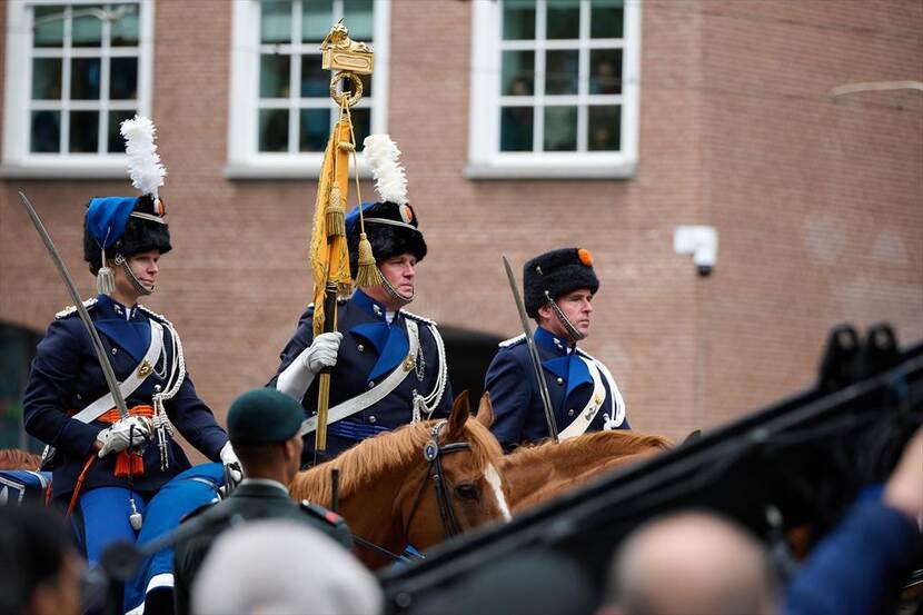 Behalve in de stoet waren er ook marechausseecollega’s aanwezig in de ere-afzetting langs de route, met dubbelposten bij paleis Noordeinde, de Eerste Kamer en de Koninklijke Schouwburg.