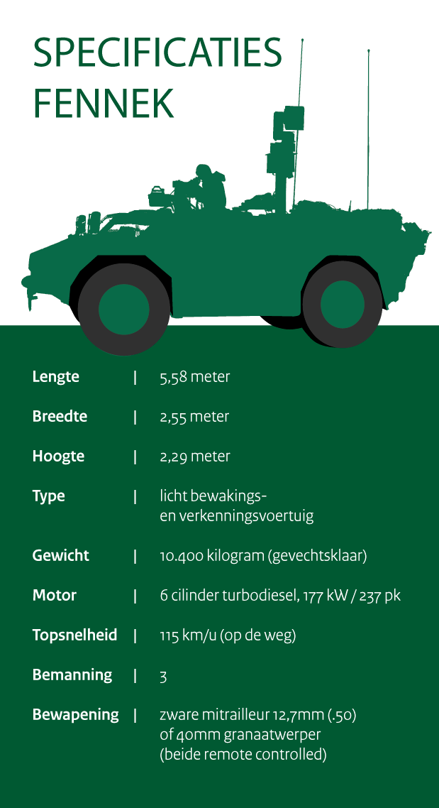 De groepscommandant van 45 Pantserinfanteriebataljon houdt met de nauwkeurige waarnemingsmiddelen van de Fennek zijn omgeving scherp in de gaten. Dankzij een laserafstandmeter, een camera die beelden omzet naar digitale informatie en een warmtebeeldkijker die zicht geeft in het donker, is Heinen volledig uitgerust voor zijn taak. Met gemak overziet hij 300 meter van de N44.