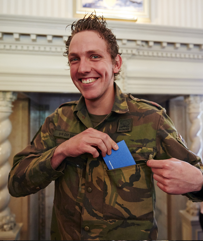Soldaat-1 Van der Velden kreeg op landgoed De Zwaluwberg in Hilversum het eerste exemplaar van hoofd krijgsmachtpredikant dominee Klaas Ubels. Het project is mede mogelijk gemaakt door de Stichting Koninklijke PIT Pro Rege en door de Stichting Herziene Statenvertaling.