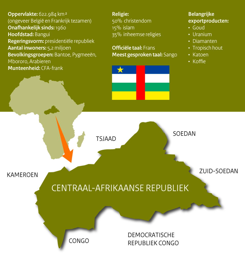 Vanaf het moment dat de CAR in 1960 onafhankelijk wordt van Frankrijk beleeft het vele staatsgrepen en opstanden. Eind 2012 beginnen de Seleka-rebellen, opgericht door een moslimminderheid in het noordoosten van het land, een geweldcampagne om de president te verdrijven. Als de rebellen in maart 2013 de hoofdstad Bangui innemen, vlucht hij. Het interim-bestuur is niet in staat om de veiligheidssituatie in het land te handhaven. Het gevolg is een geweldescalatie tussen burgers onderling en botsingen tussen Seleka- en anti-Balaka-groeperingen (vertaling: anti-machete, groepen met een hoofdzakelijk christelijke achtergrond, red) in het gehele land. Het geweld mondt uit in een humanitaire crisis. Er vallen duizenden doden, 300.000 mensen slaan op de vlucht en meer dan 650.000 mensen raken ontheemd. Ongeveer de helft van de bevolking heeft behoefte aan humanitaire hulp.