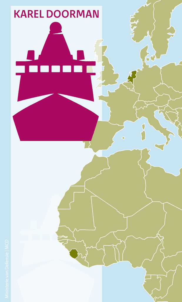 De Karel Doorman bracht de afgelopen weken 1.200 ton hulpgoederen voor de strijd tegen ebola naar West-Afrika. Het JSS - met haar 204,7 meter de grootste en nieuwste telg van de Koninklijke Marine - legde aan in 3 havens: in Sierra Leone, Guinee en Liberia.