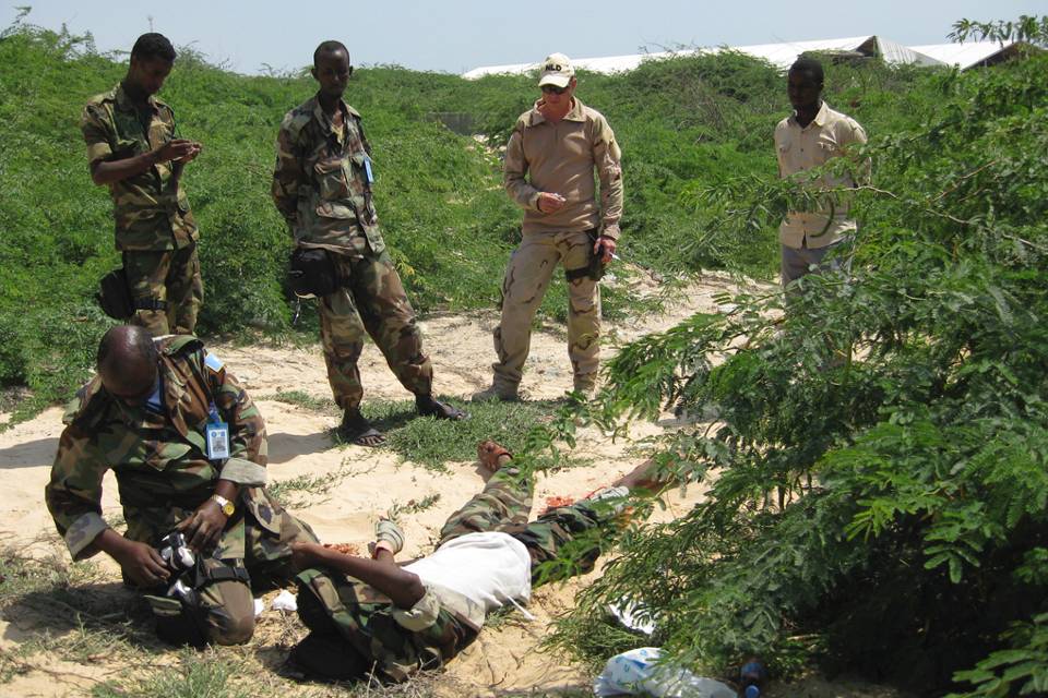 “De dagen beginnen met een rit in de ‘mamba’s’ (grote gepantserde voertuigen, red.). Voor onze veiligheid begeleidt een Italiaanse en Oegandese crew ons ‘konvooi’. De korte afstand tussen de basis bij het vliegveld en het Jazeera Training Centre (JTC) van het Somalische Nationale Leger leggen we behoedzaam af. Amper een week geleden ontplofte hier nog een autobom, vlakbij de toegangspoort naar het vliegveld. Iedereen is alert, maar de sfeer in het voertuig blijft ontspannen. Eenmaal aangekomen, druppelen de 11 cursisten binnen. Ze zijn gekleed in uniform, alleen de schoenen variëren van kisten tot sandalen en sloffen. Na zich stram in de houding te hebben gemeld, kan de les beginnen.