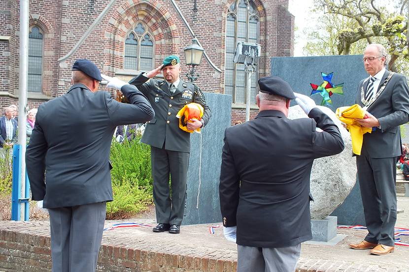 Ridder Militaire Willems-Orde majoor Marco Kroon onthulde 4 mei midden in Harmelen een monument ter nagedachtenis van collega-ridder wachtmeester Cor van Bemmel.