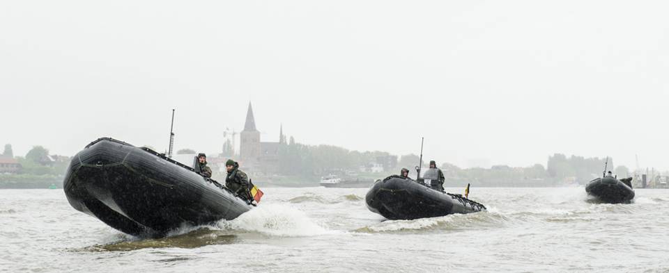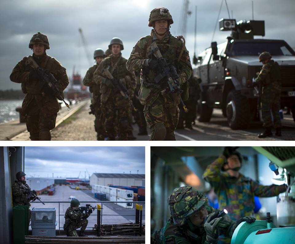 De loopbrug hangt nog maar net op de kade als het ontvangstcomité aan komt rijden. Tientallen militaire voertuigen stellen zich op voor het schip, waarna gewapende Nederlandse en Belgische genisten uitstappen.