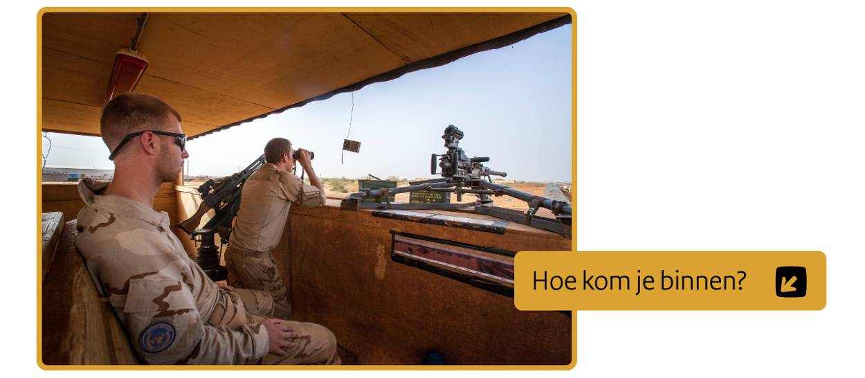 Castor ligt pal naast het vliegveld van Gao waar je vanuit Bamako met een VN-vliegtuig naartoe wordt gebracht. Castor heeft een vernieuwde hoofdpoort die ongenode gasten buiten de poort houdt. 24 uur per dag, 7 dagen in de week zorgen de mannen en vrouwen van de Force Protection voor de veiligheid van het kamp.