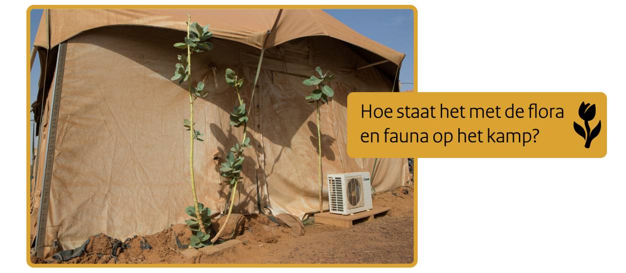Voor de bouw van het kamp is de meeste begroeiing weggehaald. Alleen op plekken waar wat water te vinden is, begint er weer wat te groeien. Dit kan zijn bij leidingen of in de buurt van airco’s die condens afgeven. Het gebrek aan vegetatie zorgt er ook voor dat je niet veel dieren tegenkomt. Er leven onder andere muizen, slangen, hagedissen en camel spiders. Het blijft oppassen, maar je zult ze niet vaak zien.