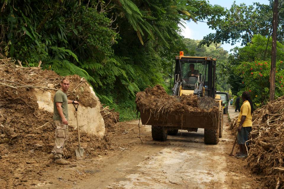 Genisten van de CLAS-compagnie in de West kunnen met voldoening terugblikken op de noodhulp die zij onlangs leverden op het eiland Dominica. De tropische storm Erika veroorzaakte daar enorme aardverschuivingen en steenlawines, met als gevolg doden, gewonden en honderden vernietigde huizen en weggespoelde wegen. Samen met mariniers en lokale hulporganisaties zorgde de genie ervoor dat de belangrijkste infrastructuur weer enigszins op orde kwam.