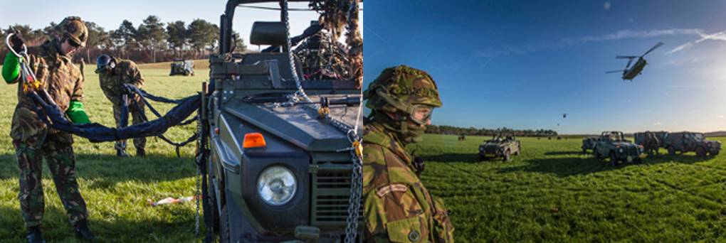 Links: De riggers controleren het materieel nog een laatste keer. Rechts: Een heli handling instructor ziet toe op de aanhaakprocedures.