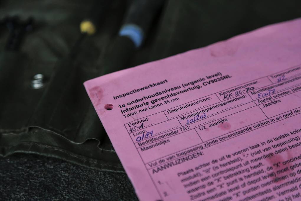 “We zijn net terug van een oefening. Op de kazerne halen we alle voertuiguitrusting uit de CV-90. Je telt wat je mist en schrijft het op. Dan beginnen we aan de instructiewerkkaart (IWK) of de roze lijst. Het is een grote checklist, dat werkt makkelijk.