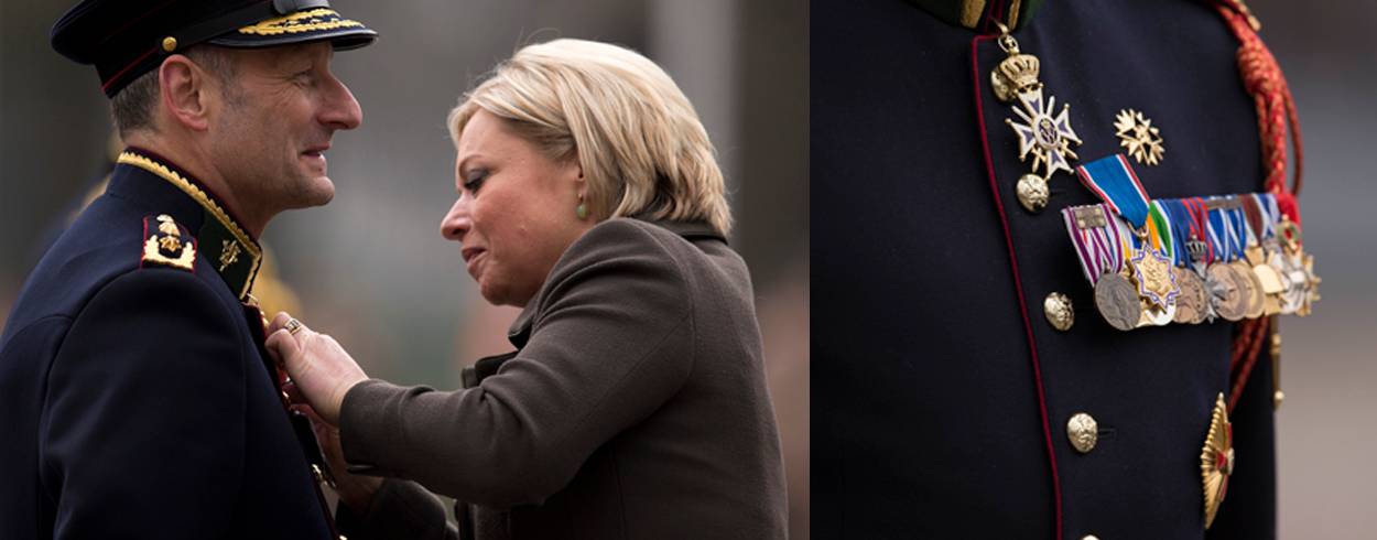 Die voortdurende toewijding beloonde de bewindsvrouw met het Ereteken voor Verdienste in Goud. “Uw inzet is van grote waarde geweest. En meer dan dat. Waarvoor grote, grote dank”, sprak Hennis. Ze prees hem onder meer voor zijn inspanningen als commandant Regional Command South Afghanistan, en voor de integratie van 11 LMB en 43 Mechbrig in Duitse eenheden.