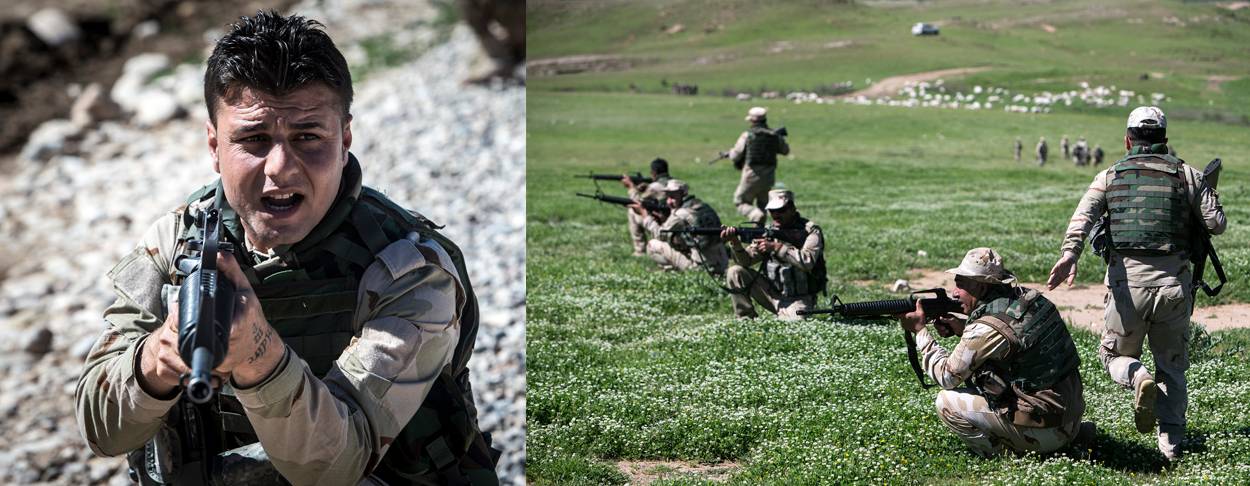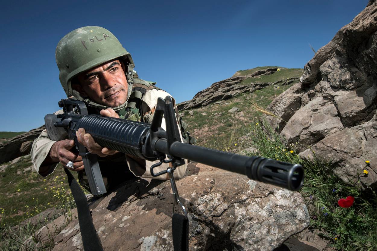 De felle zon draait naar zijn hoogste punt. Vogels tsjirpen, vlinders zoeken fladderend hun weg. Ruisend gras staat vol prachtige weidebloemen. Als je niet beter wist, zou je denken dat je in een vakantiebrochure bent gestapt. Maar nee, dit is Noord-Irak. De zaligmakende rust wordt ruw verstoord door een krakend salvo uit een M16, het wapen dat de Koerdische Peshmerga sinds kort hanteert. Het lawaai stuitert via de heuvels de vallei uit.