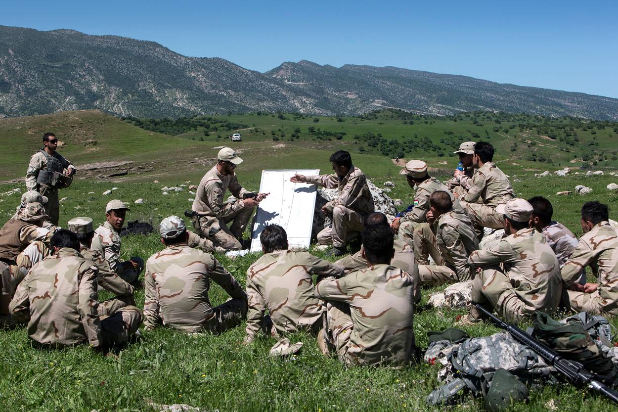 Trainen doet men dus in het dal. Sergeant Jack leert een groep Peshmerga's tunnelen; met vuur en beweging achterwaarts verplaatsen tijdens een vuurgevecht. “We doen dit stap voor stap”, instrueert hij zijn leerlingen met behulp van een tolk. “En houd elkaar goed in de gaten!” Als ze de drill een paar keer geestdriftig hebben uitgevoerd, krijgen ze rust. Tijd voor water en sigaretten. De zwetende mannen – het is ruim 30 graden Celsius – geven aan blij te zijn met de opgedane kennis, ‘want we patrouilleren heel veel in de straten en dit is erg goed om te weten’. Jack vertelt dat ze op deze manier ook dekking kunnen vinden achter een heuvel of een peloton veilig uit een gebouw kunnen krijgen.