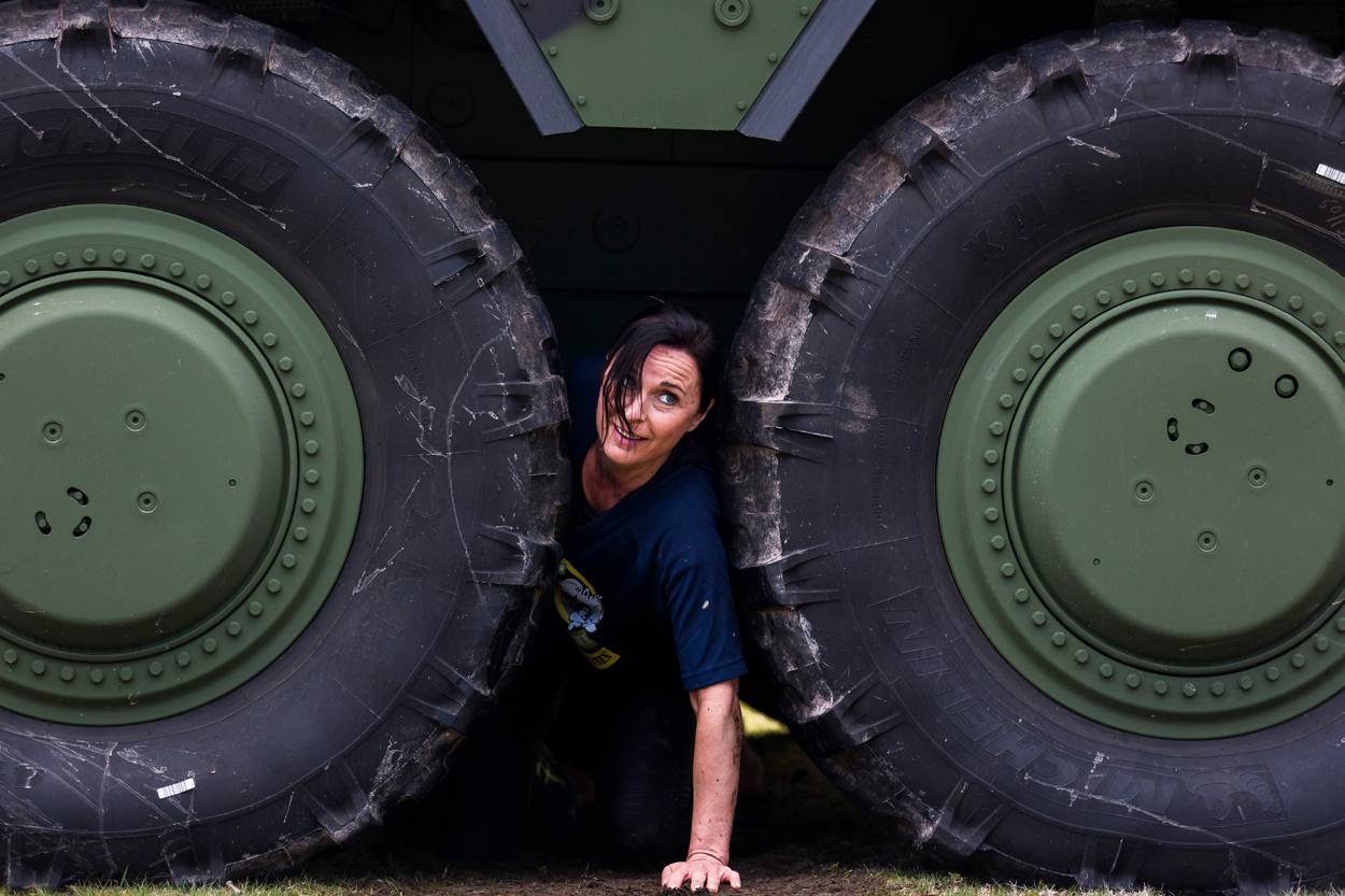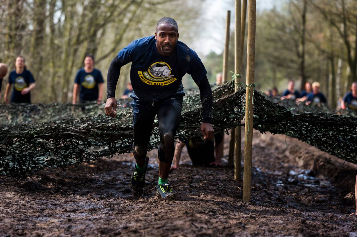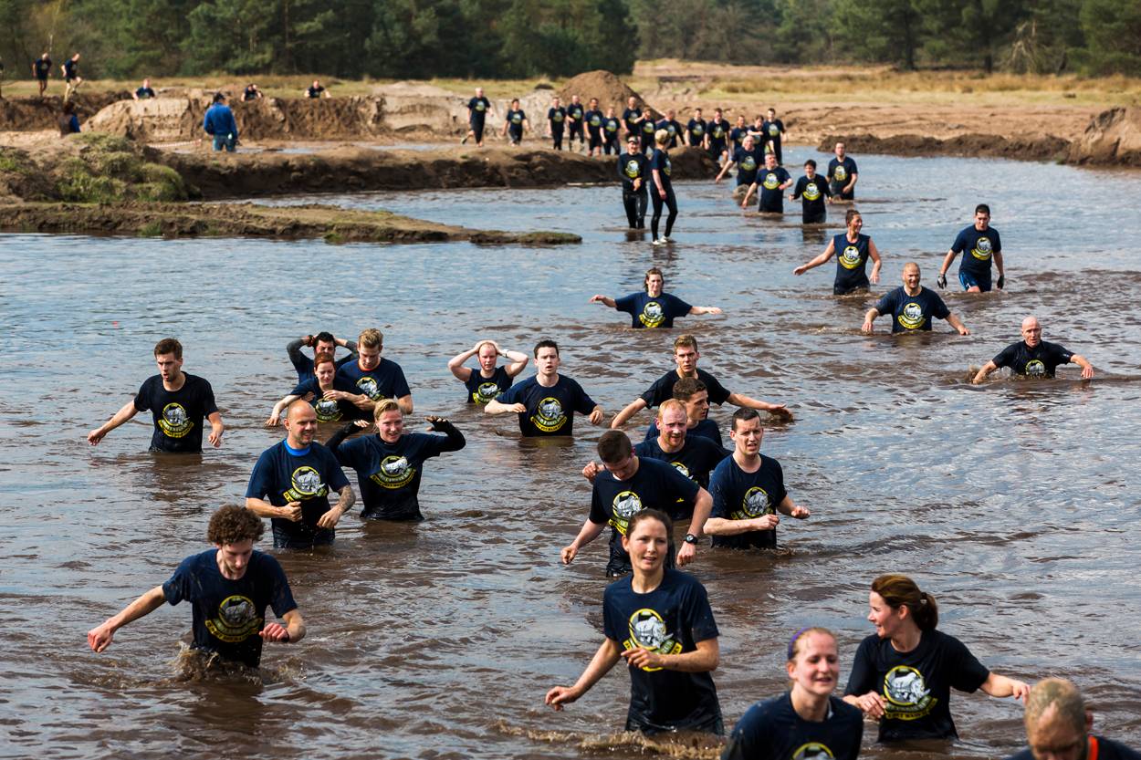 Bij de start doet elke groep een warming-up om goed voorbereid aan de sportieve uitdaging te beginnen. Op harde beats springen de deelnemers op en neer, doen ze push-ups en squats. “Lekker diep gaan! Keurig!”, roept de sportinstructrice bemoedigend. Om de paar minuten gaat een nieuwe afdeling over de startlijn. Sporters ploegen door het mulle zand, lopen over asfalt, rennen door het bos en snellen over de heide. Ook waden ze door sloten, terwijl er om hen heen wordt ‘geschoten’. Een van de deelnemers gooit voor de grap haar handen in de lucht: “Ik geef me over!”.