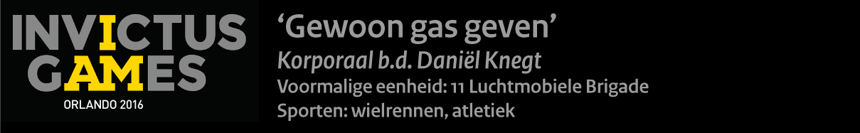 Zijn nieuwe uitdaging: paratriatlon. Zwemmen, tandemfietsen en lopen. De Invictus Games zijn voor deze topsporter een tussenstop op weg naar de Paralympics in 2020. Met Cor van Leeuwen als zogeheten piloot neemt ‘stoker’ Knegt in Orlando deel aan het wielrennen. “Deelnemen aan de Invictus Games doet me wel meer dan ik dacht”, geeft hij toe. “Het is bijzonder met militairen onder elkaar te zijn. Niemand hier is met elkaar te vergelijken, maar iedereen is van ver gekomen.”
