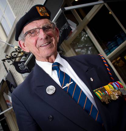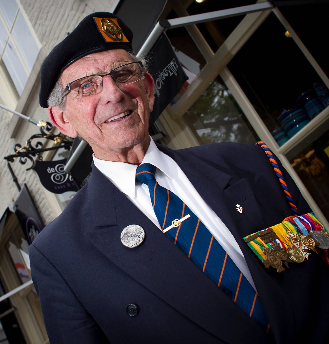 “Na 4 weken opleiding werd ik in 1944 naar het front gestuurd. ‘Doe je best voor het Vaderland’, werd me aan de poort gezegd. Ik was net 18 en belandde in Hedel al snel in zware gevechten. Twaalf kameraden sneuvelden. Een paar dagen later werd de capitulatie in Wageningen ondertekend. Ik stond letterlijk op 100 meter afstand. Opgelucht en blij was ik, maar verdrietig om m’n maten die vlak voor de bevrijding waren omgekomen. Als bevrijders trokken we via Utrecht en Leiden – mijn geboortestad – Den Haag binnen. Dat was vreemd. Na een lange tijd zag ik mijn familie weer. Twee jaar later vertrok ik vrijwillig naar Nederlands-Indië. Als infanterist maakte ik in de voorste linie veel acties mee. Regelmatig lagen we onder vuur. De oorlogen hebben me gehard. We leefden continu in spanning. De saamhorigheid in het leger staat mij na 42 dienstjaren het meest bij. Dat kom je nergens anders tegen. Of ik nou een luchtmachter, landmachter of marineman tegen kom, ik voel direct een band. En dan hoef je niet eens over veldslagen te praten. Ook jonge militairen zie ik met veel plezier. Die knullen tonen respect voor me, en ik voor hen. Al een aantal keer reikte ik ze het invasiekoord uit. Dat doe ik met trots. Reünies zoals deze vind ik fantastisch. Zolang ik dit nog kan meemaken, ben ik erbij.”