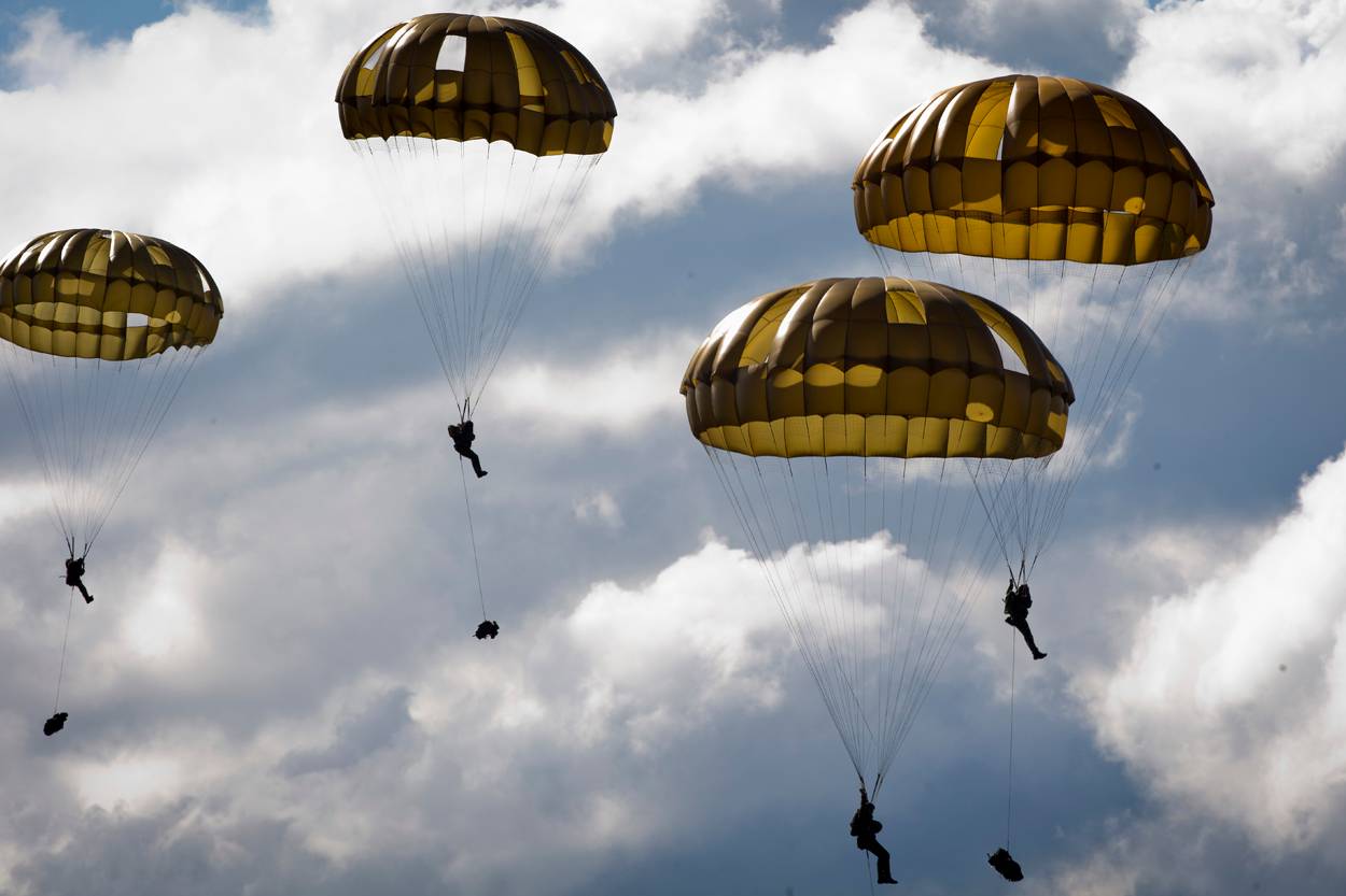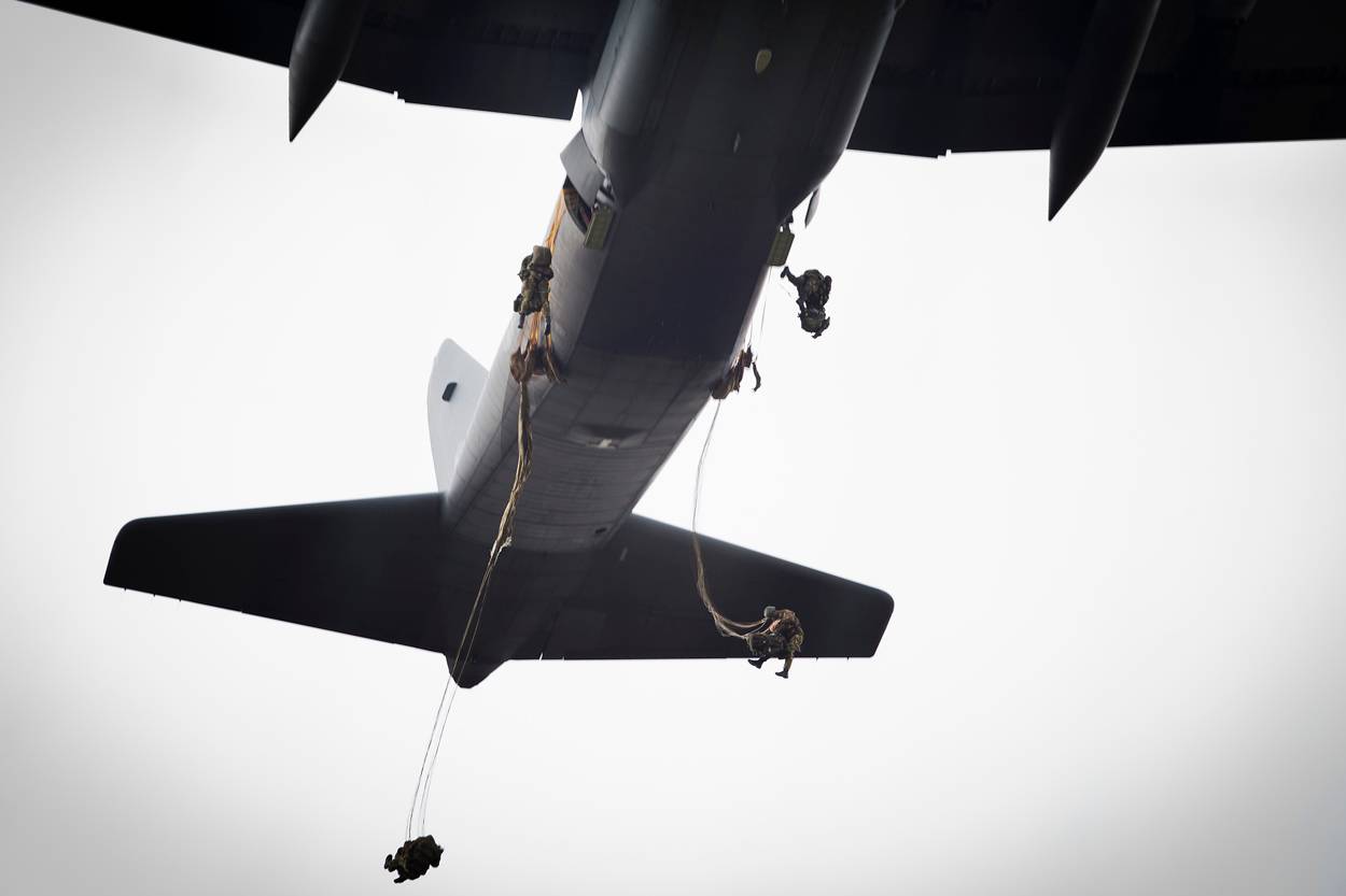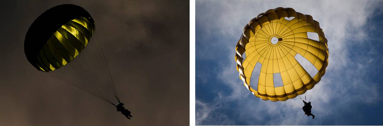 Binnen enkele seconden hangt de lucht boven dropzone Bunker vol ‘bolletjes’. Wind staat er nauwelijks boven de Duitse oefenplaats Grafenwöhr en de afdaling gaat rap. Onder elke parachute bungelt een militair met 50 kilo bepakking. Om de landing te verzachten houden de para’s hun benen bij elkaar, het lichaam lichtgekromd, de spieren aangespannen….zodra hun voeten de grond raken maken ze een zogeheten pararol om te voorkomen dat botten breken.