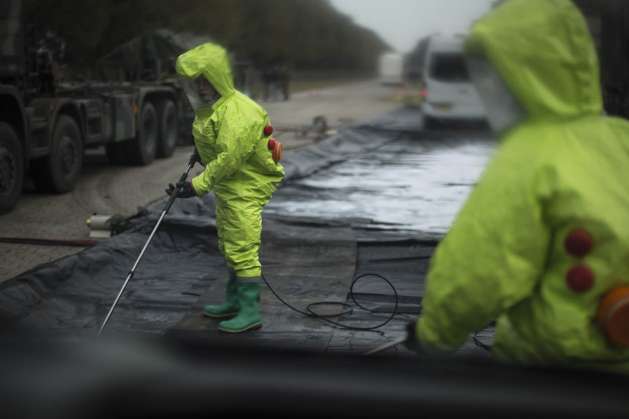 “We voelen ons zeer welkom. We zien hier hoe de Nederlandse CBRN-specialisten te werk gaan en leren zo bij. Erg interessant. Onze aanpak komt grotendeels overeen met die van de Nederlanders, al zijn er ook verschillen. Zo hebben wij een mobiele hijskraan voor het schoonspuiten van voertuigen, terwijl Nederlanders steigers neerzetten. We communiceren met onze Nederlandse collega’s in een mix van Duits en Engels. Het is soms even zoeken naar woorden, maar we komen er altijd uit.”