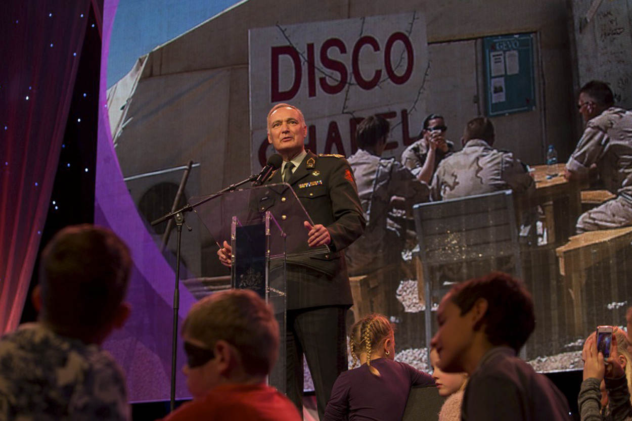 Op het podium spreekt hij het thuisfront met opbeurende woorden toe. “Uw betrokkenheid is cruciaal en ik weet dat dit niet altijd makkelijk is. Maar door uw onvoorwaardelijke steun zitten de militairen goed in hun vel en kunnen ze hun werk goed doen.”