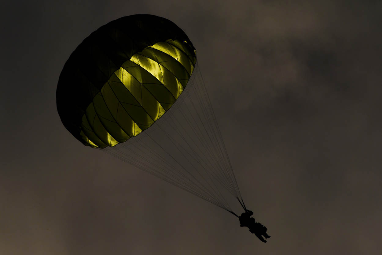 ^ Tijdens oefening Swift Response zweeft een rode baret van 11 Infanteriebataljon boven dropzone ‘Bunker’ in de Duitse oefenplaats Grafenwöhr.