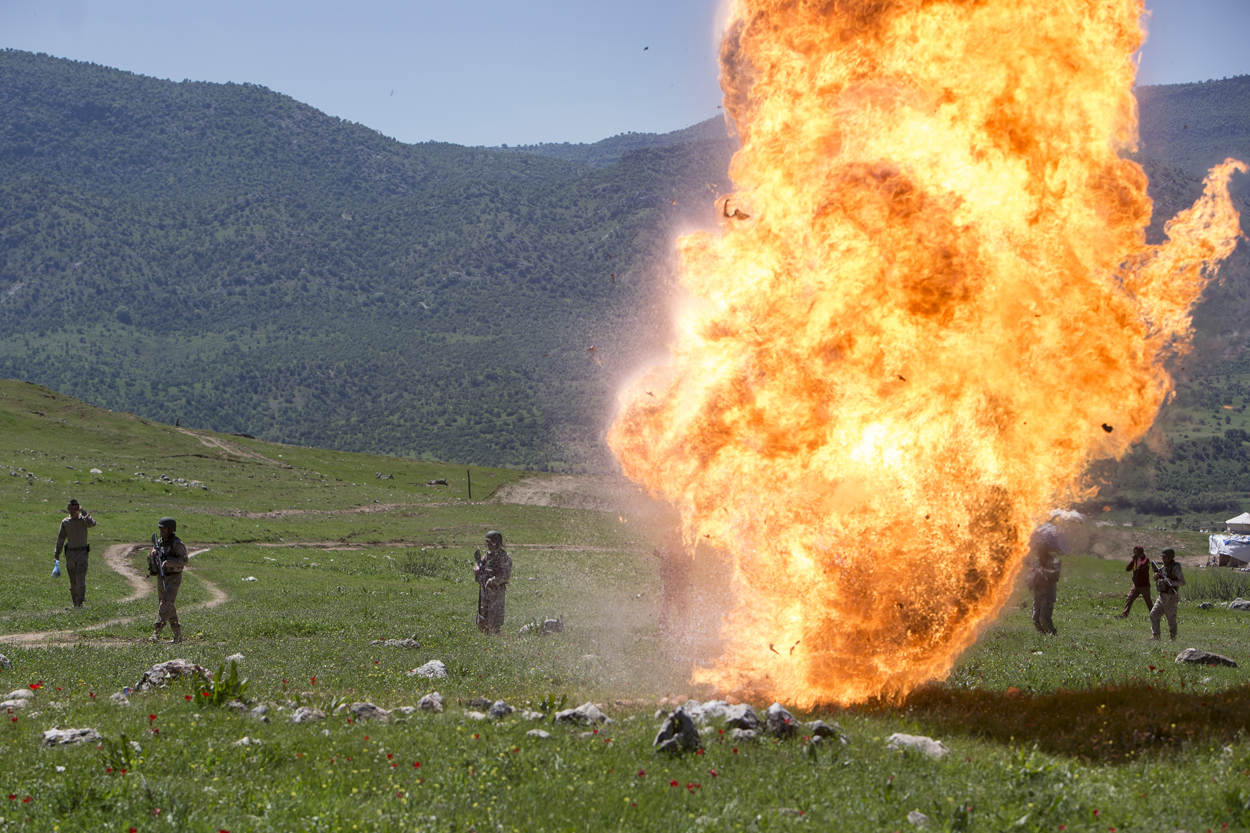 ^ Koerdische Peshmerga krijgen het zwaar voor de kiezen in een oefenscenario dat de trainers van 45 Pantserinfanteriebataljon opspelen in Noord-Irak.