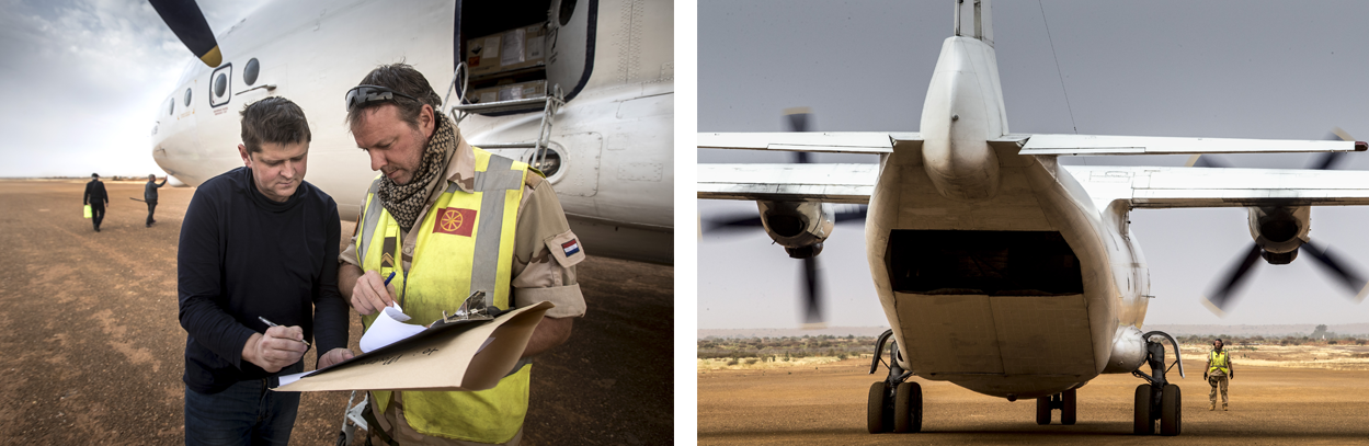 Korporaal Wouter ziet ‘m als eerste: “Check die rook!” Bart stiefelt al weg. Hij zoekt een geschikte plek vanwaar hij het Oekraïense toestel kan gidsen. Met universele handgebaren, het zogenaamde marshallen, loodst hij de vlieger naar zijn parkeerplaats. Veel speelruimte is er niet. Er moet ruimte overblijven op Tango, want er landt straks ook een Antonov voor het Duitse contingent. Wanneer de 4 propellers stil staan, seint Bart naar de collega’s dat ze de kist kunnen ontladen. “De vlieger reed te hard, man. Ik moest hem echt aansporen gas terug te nemen”, zegt Bart, terwijl hij het papierwerk, cargo manifest, data voor de douane et cetera, doorneemt met de Oekraïners.