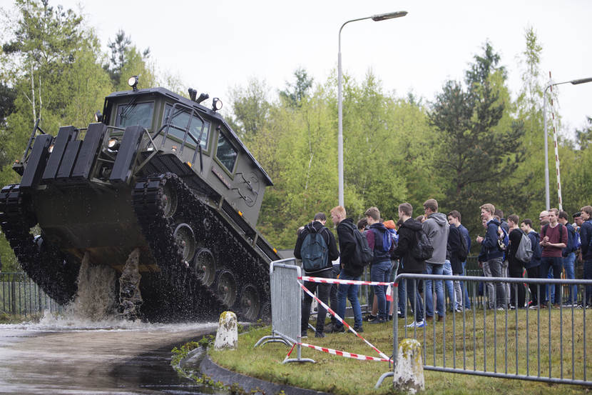 De 15-jarige Dennis is zo’n jongen die de kolonel maar wat graag enthousiast ziet worden. Met zijn vmbo-opleiding mobiliteit en autotechniek zou hij niet misstaan op de technische werkvloer van de landmacht. De jongen zelf zit nog in dubio. “Ik wilde een eigen autogarage, maar ik vind die grote dingen hier ook wel echt mooi man. In een garage ben je zo klaar met een auto, maar met zo’n tank (CV90 red.) ben je wel even wat langer bezig, denk ik. Dat lijkt me wel echt vet.”