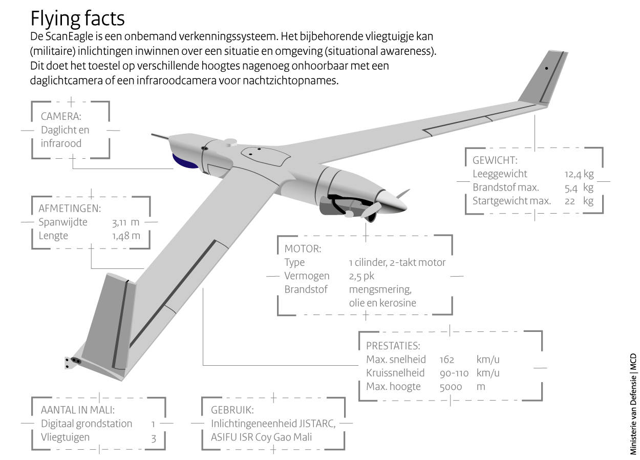 De Sperwer is in 2011 vervangen door de ScanEagle, die geavanceerder is en langer in de lucht kan blijven (zie infographic onderaan). Daarnaast is er de kleinere Raven, die eenheden te velde de lucht in kunnen sturen. Alles bij elkaar is er met deze toestellen vele duizenden uren aan missies gevlogen. Niet alleen boven de woestijn van Mali of voor de kust van Somalië, maar ook boven Nederland om politie en justitie te ondersteunen bij de opsporing van personen en het meekijken bij verdachte praktijken.