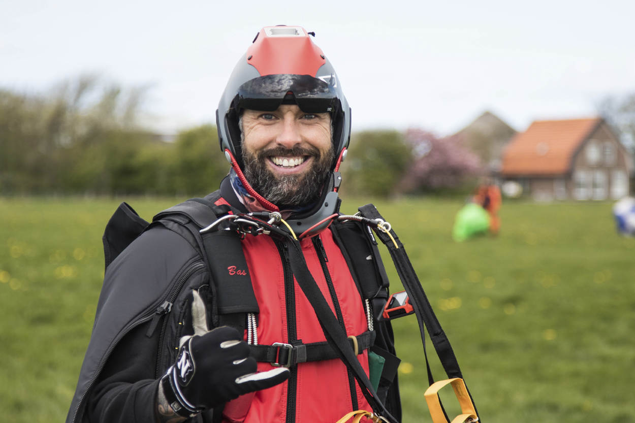 Een wingsuit is het best te omschrijven als een groot pak met vleugels onder de armen en tussen de benen, waardoor de springer trager naar beneden valt. Er is dus meer valtijd voordat de parachute open moet. “De neerwaartse snelheid wordt omgezet in voorwaartse snelheid”, vat Sebas samen. Een vrije val vanaf 10.000 voet duurt zo al snel ruim een minuut. Wie zonder wingsuit springt, moet vanaf die hoogte binnen 35 seconden zijn parachute al trekken. “Langer genieten dus.”