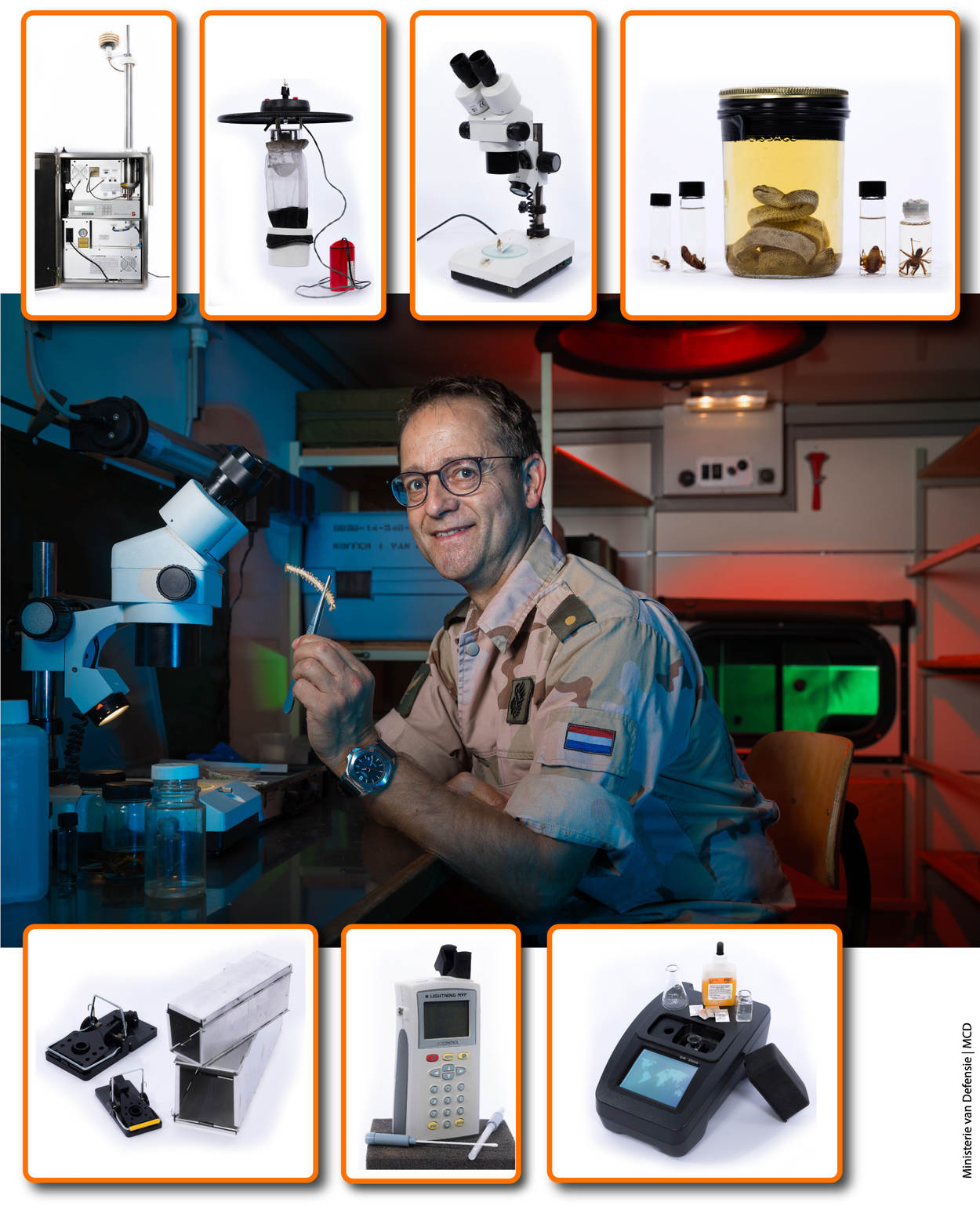 Behalve dat ik op persoonlijke hygiëne wijs, controleer ik de sanitaire voorzieningen, de opslag, werkoppervlakten en afvalverwerking van de keuken, de temperatuur van maaltijden en bestrijd ik ongedierte. Kakkerlakken, spinnen, schorpioenen, slangen, malariamuggen, vliegen, teken, luizen, vlooien en muizen; er zijn zoveel kleine beestjes waarvoor je moet oppassen. Weren of vangen zijn de beste methodes om ervan af te komen. Ik probeer alles te pakken en te vangen, ook micro-organismen uit het water. Als vangen niet lukt, fotografeer ik ze. Van alles dat vliegt, kruipt en zwemt wil ik exact weten wat het is, hoe het zich gedraagt en wat het kan veroorzaken. Mijn motto is: ken uw vijand en u weet hoe u hem het hardst kan pakken.”