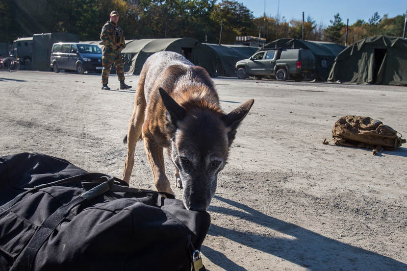 De Belgen en Nederlanders vullen elkaar hier goed aan. Neem nou voertuigsearch. Dat doen wij heel uitgebreid. Het schijnt dat de Belgen dat nu ook toepassen. En kijk je naar de nieuwe MineLabs (metaaldetectoren, red.) van de Belgen, zijn wij daar weer jaloers op. Het is een gigantisch mooi, compact ding. Kan zo in de rugzak. Zij hebben ons geleerd hoe je hem uitpakt, aanzet, instelt en gebruikt. En zij werken in buddyparen met 2 honden als ze gaan lopen. In Nederland doen we dat niet standaard. Die viervoeters gaan puur voor explosieven. Als we met de Belgen samenwerken, weten we zeker dat we honden hebben – voor ons ideaal.