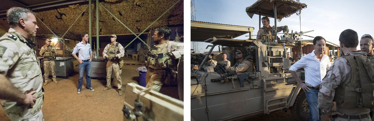 Op het centrale plein van Kamp Castor stond Rutte voor de troepen. “Jullie doen fantastisch werk, met heel veel lange afstandsverkenningen die de ogen, oren en soms ook de tanden van de missie vormen. Dit is nog steeds een hele grote missie. En we zien de effecten. Vluchtelingen en ontheemden die terugkeren naar Mali. Tegelijkertijd komt het aantal mensen dat Mali uit reist stapje voor stapje onder controle. Door de instabiele ring rond Europa te stabiliseren, zorgen jullie er mede voor dat Europa veilig blijft. En dat werk is niet zonder gevaar. Dus ik wil afsluiten met een warm applaus voor jezelf.”