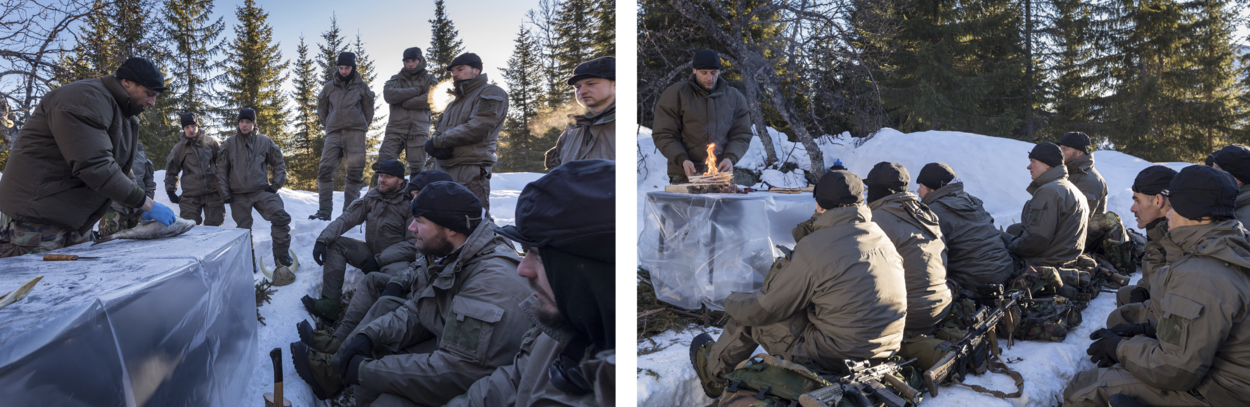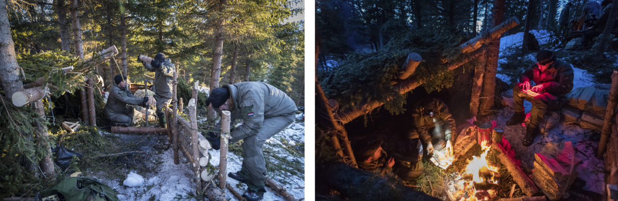 Terwijl de Charliebatterij middenin het bos provisorisch van hout en dennentakken een schuilplek fabriceert, verse kabeljauw van ingewanden ontdoet en vuur maakt, concludeert opperwachtmeester Martine Janssen dat hun nachtverblijf misschien wel erg groot is. “Ach, nu hebben we een familiecottage”, reageert ze lachend. Ze is de enige dame van het gezelschap, maar ze doet niet onder voor de rest. Ze is beresterk en werd na de training zelfs uitgeroepen tot ‘best man’.