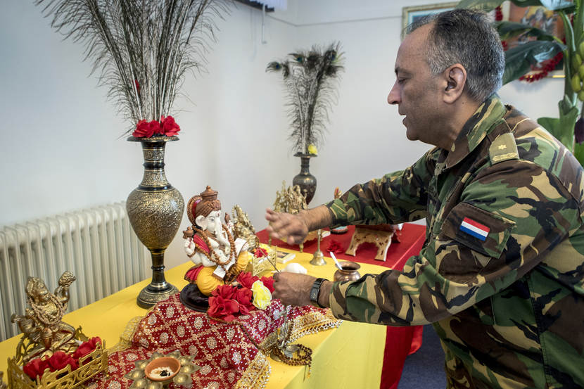 “Nee, het is juist leuk dat ik binnen de krijgsmacht de mogelijkheid heb om vanuit mijn achtergrond geestelijk verzorger te zijn. Ik breng iets dat van toegevoegde waarde kan zijn voor militairen en krijg daarvoor alle ruimte. Zo organiseren we hindoeïstische vieringen op de Frederikkazerne in Den Haag. Vorige week hebben we Holi gevierd (soort lentefeest, de overwinning van het goede op het kwade, red.) en in november vieren we het Divali Lichtjesfeest. Militairen komen weleens naar me toe met de vraag of ik een rol wil spelen tijdens een ritueel. Dat kan het kaal scheren na de geboorte zijn, maar ook het huwelijksritueel. En als we de mogelijkheid hebben, nemen we militairen mee op een bezinningsreis.”